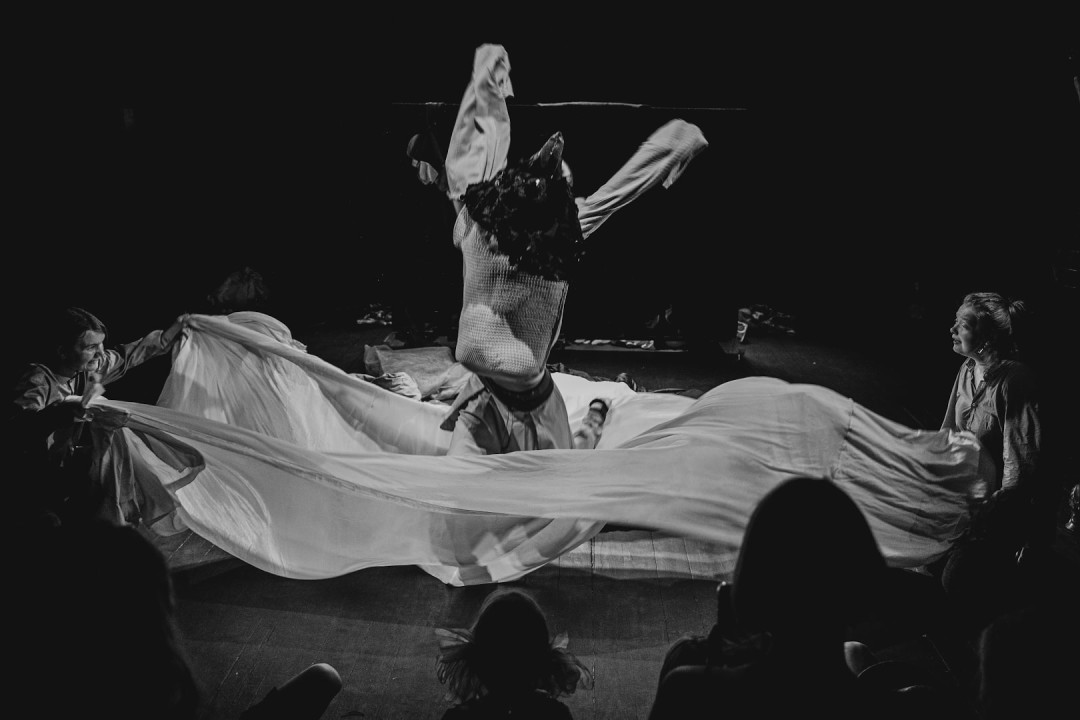 Еще один спектакль, рожденный из показанного на фестивале «БТК.Generation» эскиза в этом январе. Конечно же по Достоевскому, от которого никуда не скрыться в год его юбилея. Владислав Тутак использовал «Преступление и наказание» в качестве каркаса для камерного хоррора. Причем необходимого эффекта режиссер добивался простыми, но действенными средствами: зрителей посадили в трюм сцены, откуда, задрав головы, они пытались разобраться, что же происходит наверху. А там то виднелись лишь белые чулочки Сонечки Мармеладовой, то мелькали лошадиные ноги, под которыми погибал ее папаша. Во Флигеле «Субботы» трюма нет, зато полно закоулков, из которых вполне может вылезти вообще черт-те кто.