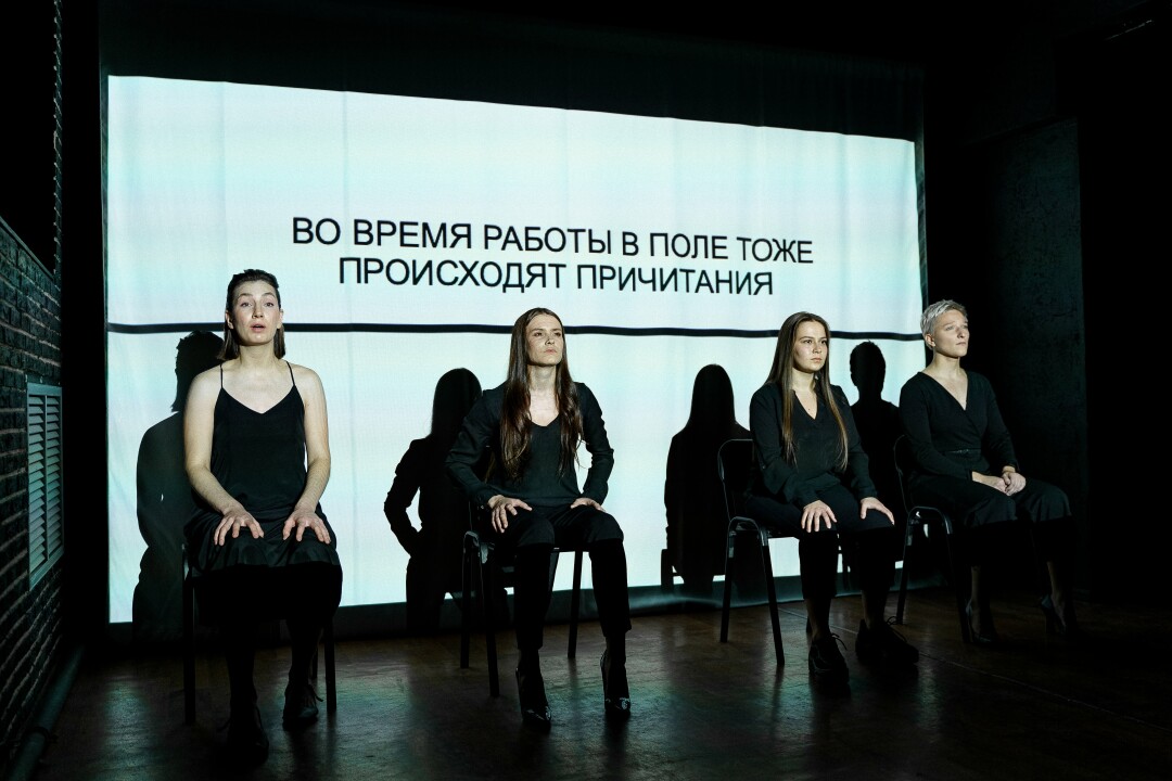Во второй части экспериментального перфоманса режиссер Полина Кардымон рассуждает через все ту же форму — обрядовые песни — о смерти. Например, почему невест на Руси оплакивали, как умерших. И как вообще через музыку рефлексировать (и возможно ли) об уходе из жизни близких. Четыре актрисы (Алина Юсупова, Анна Замараева, Наташа Серкова и Даша Воевода) исполняют средневековые русские песни, сопровождавшие человека при рождении на свадьбе и похоронах.