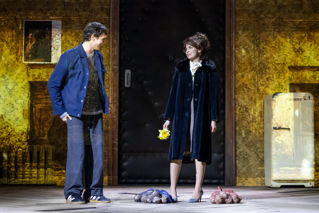 Дом его давно опустел и обезлюдел. Остались только голые стены с узорчатыми обоями, черно-белый телевизор и холодильник с крупной надписью «Родина» — эти осколки убогого советского быта приобретают тут значение почти мистическое. В телевизоре бубнит вечный Брежнев, в холодильнике наросла вековая наледь. Сценическое пространство (художником выступил Семен Пастух!) напоминает широкую воронку: оно распахнуто в зрительный зал, а другим концом упирается в черную клеенчатую, непропорционально огромную входную дверь, за которой, как в магическом портале, возникают действующие лица этой драмы, красиво припорошенные театральным снегом.