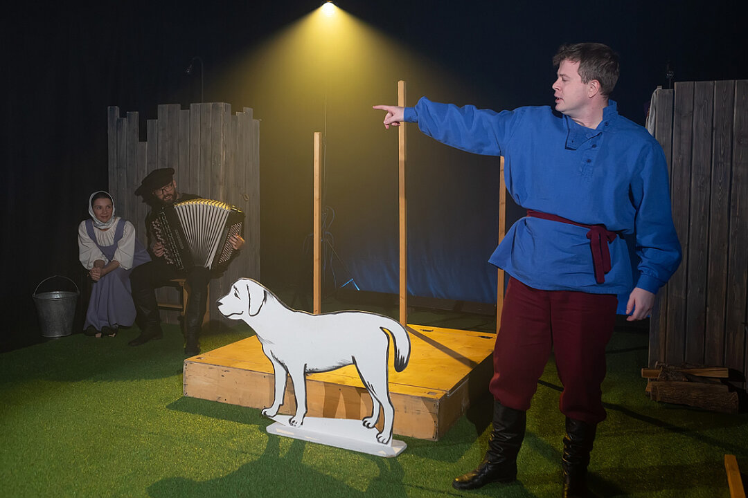 Под стать бесхитростной истории и сценография Ксении Ольховской, сотворенная как будто из того, до чего удалось дотянуться: фанера, пульверизатор, картина из бабушкиной квартиры. Кошку, пса и змею авторы убирают на второй план, на первый выводя людей, которые то ссорятся, то не замечают очевидных экивоков, а то и вовсе ведут себя как совершеннейшие обалдуи.