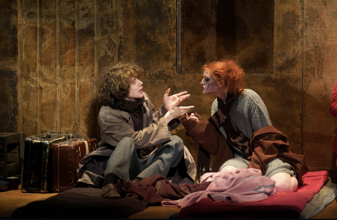 Баланс и расстановку сил меняет появление таинственного героя (его играет Ярослав Васильев). От остальных он отличается и внешне (цилиндр, черное длинное пальто со множеством пуговиц, круглые темные очки!), и внутренне. Появившись из темного прохода между стенами, он усаживается на тумбу, где и проводит практически все отведенное ему в спектакле время. У Горького он зовется Лукой и от роду ему шесть десятков лет. Лев Додин переименовал Луку в Странника и сделал ощутимо моложе. Разумеется, неспроста. Герой актера Васильева демонстрирует повышенную эмпатию и почти каждого одаривает надеждой на перемены к лучшему, что лишь оттягивает трагическую развязку. Кульминационный монолог про гордо звучащего человека Сатин произносит в окружении всего пятерых обитателей ночлежки, сумевших не сгинуть в той черноте, которая все это время словно воронка затягивала в себя одного героя за другим. Завершается же спектакль известием о самоубийстве Актера. Приносит его не Барон, как в оригинале, а рыжая Настя. И та надежда на будущее, теплившаяся несколькими сценами раньше, рушится окончательно и бесповоротно.