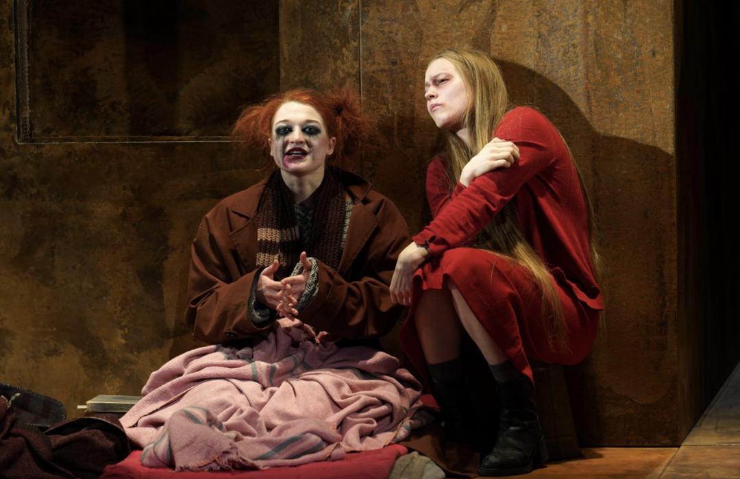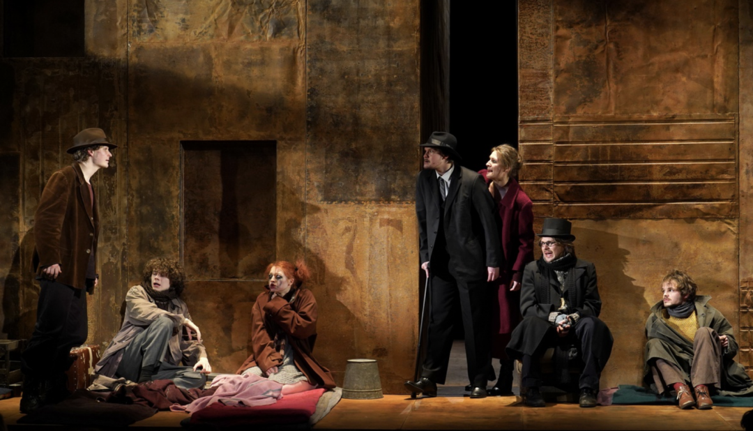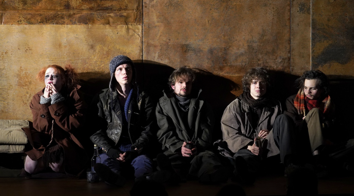 Вместе с постоянными соавторами — художником Александром Боровским и светорежиссером Дамиром Исмагиловым — Лев Додин придумал максимально лаконичную форму для высказывания. Действие разворачивается на авансцене: герои словно зажаты между зрительным залом и двумя огромными, уходящими под колосники (решетчатый настил. — Прим.ред.) стенами, покрытыми ржавыми листами, с парой дверных и оконных проемов, до поры до времени закрытых. Такими же листами «обшит» планшет сцены. То ли это трюм давно сидящего на мели или основательно затонувшего корабля, то ли подвал какого-то гигантского здания. Одним словом — дно. Пока зрители заходят в зал и рассаживаются, на сцене бесшумно появляется несколько героев: Бубен (Денис Ищенко) и Барон (Виктор Яковенко) немедленно заваливаются спать, а рыжеволосая Настя (Анастасия Рождественская) усаживается читать книгу. Именно ей принадлежит одна из ключевых реплик в этом спектакле. «Вы… не люди… вы — ржавчина!» — произносит она в начале, а не в финале, как прописано у Горького. Коррозия здесь, конечно, разъедает не только и не столько стены и пол ночлежки, но личности и души. Выбраться из этого состояния, если и надеются, то очень немногие.