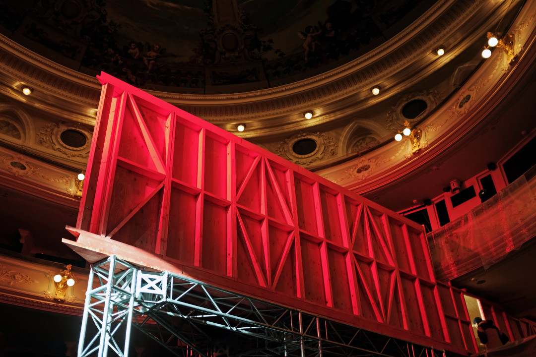 Что для меня важно в этом проекте? Андрей, зная, что я работаю с фанерой, пригласил меня как свободного художника, а не сценографа. Сначала я хотел добавить детали, фрагменты какие-то, но мне это показалось недостаточно радикальным, поэтому я решил попытаться создать совершенно новое пространство внутри некого другого пространства. В старом новое. Но не временную экспозицию, а новую архитектурную театральную традицию.