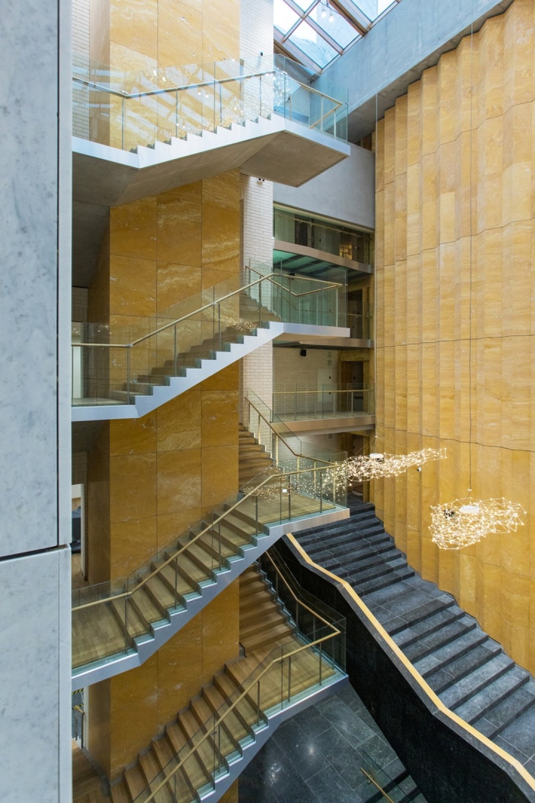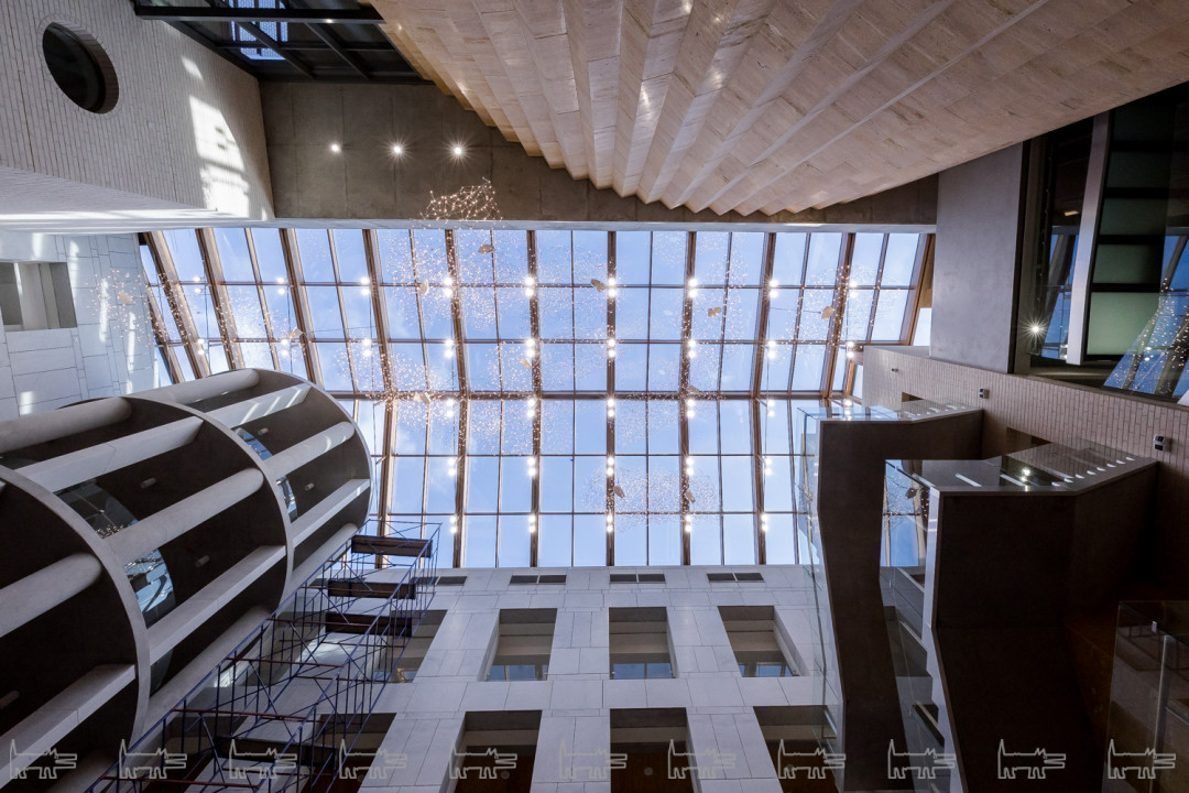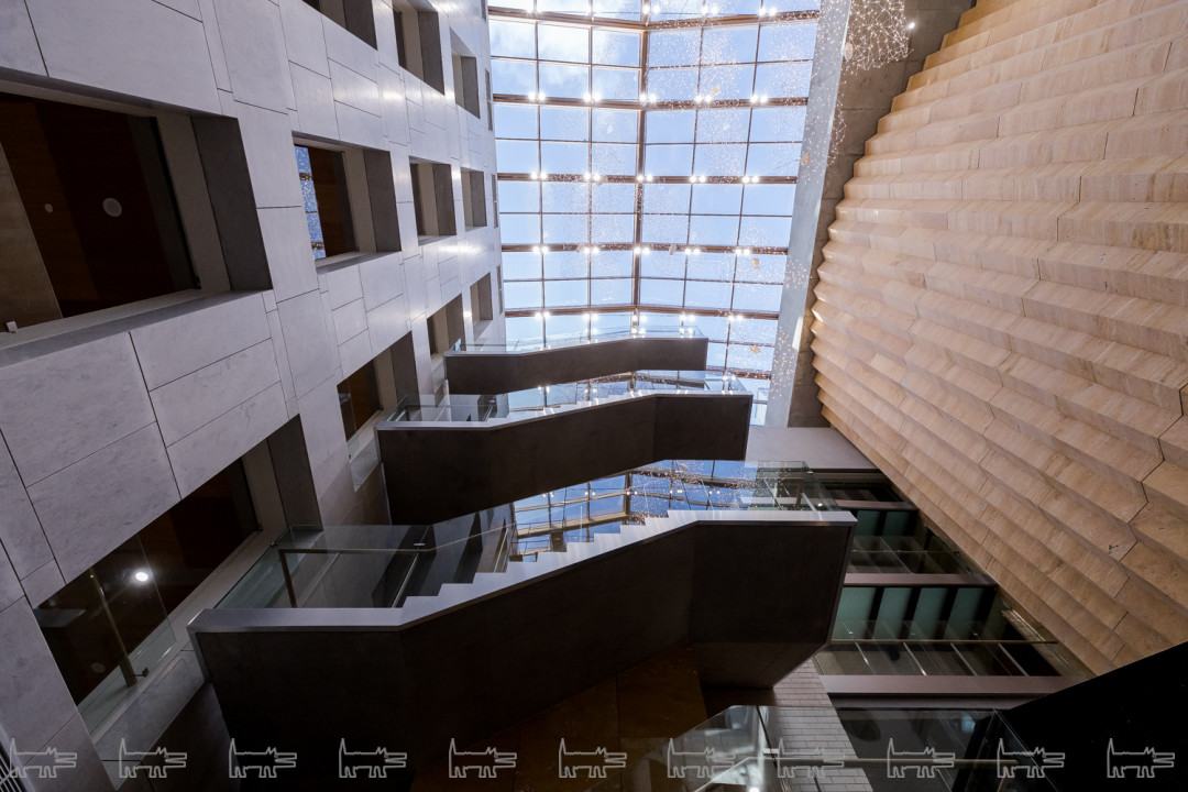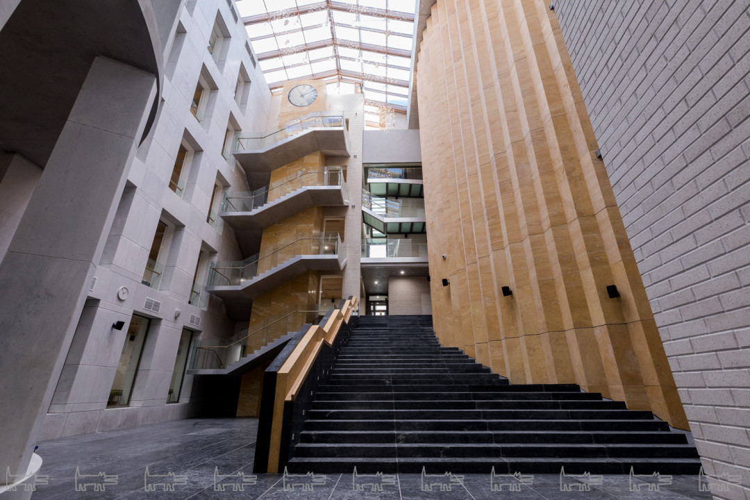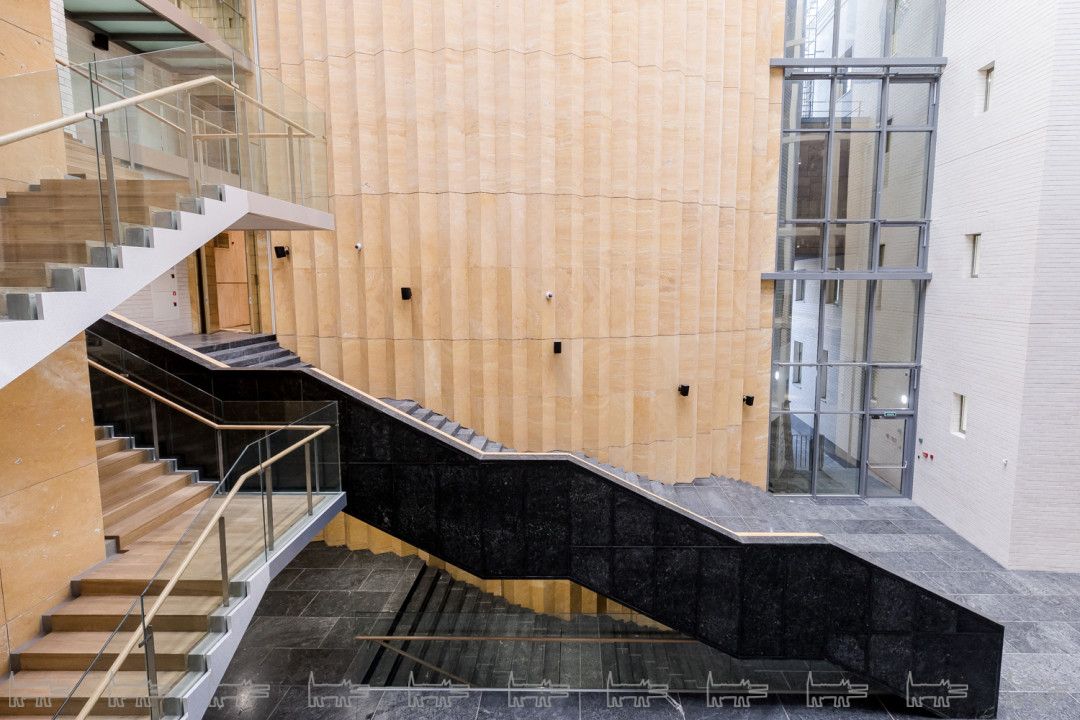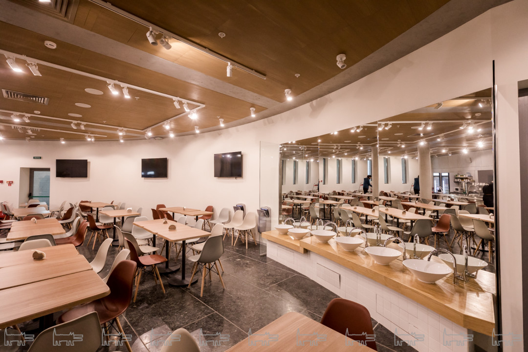 Эпитет "многофункциональное" на все сто процентов применим к этому пространству. Школьный двор остался школьным двором, только стал крытым атриумом — главной рекреацией, куда выходят окна школьных коридоров и холлов. В дни спектаклей он превращается в фойе театра, впускает публику и становится маленькой городской площадью. В коридорах и холлах первых двух этажей разворачиваются театральные буфеты. Эта метаморфоза происходит легко, такой уж характер у этой рекреации-фойе — не помпезный, но открытый, живой и праздничный».