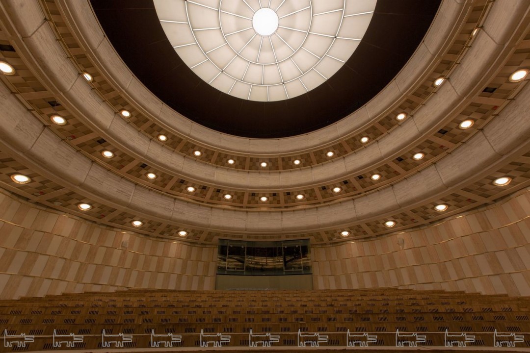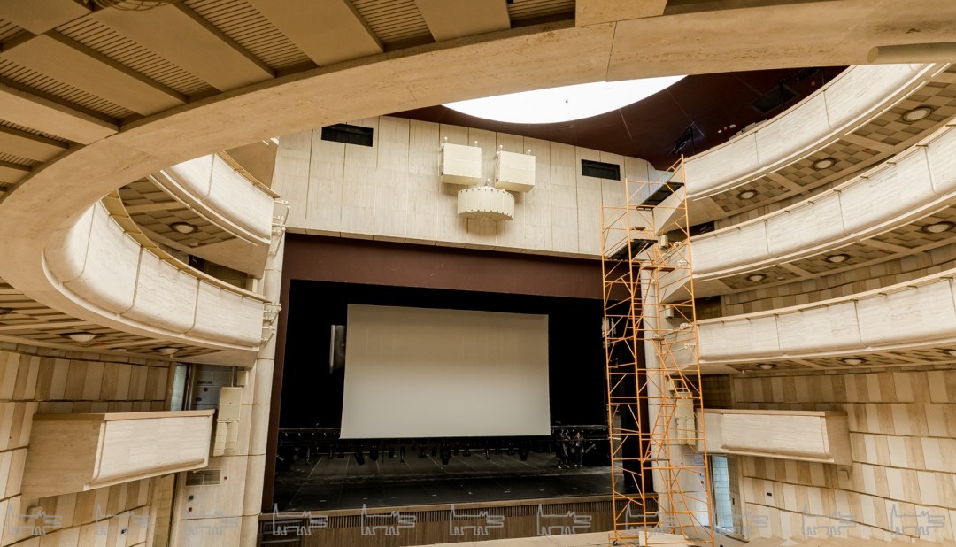 Зрительный зал вмещает 500 человек, он сделан в форме амфитеатра с тремя ярусами, из которых последний – технический. Задняя часть сценического пространства оборудована большим светодиодным экраном. Второй экран, меньшего размера, расположен в передней части сцены. Пол такой же, как и во всех передовых залах мира – на нем балетный немецкий линолеум «Арлекин». Недалеко от сцены – шесть современных гримерных в общей сложности на 70 человек.