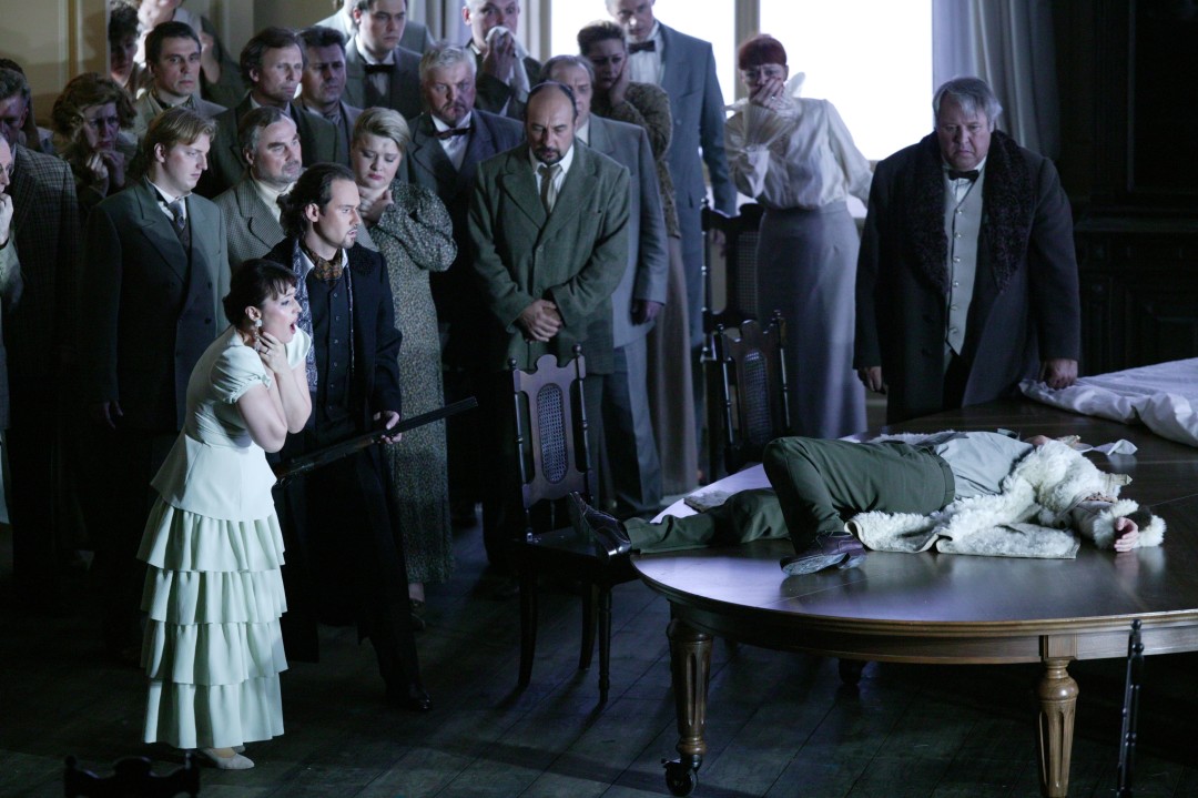 От Чернякова ожидали чего-то авангардного. Перед премьерой по Москве ползли слухи о том, что Татьяна будет писать Онегину смс-ки. Но спектакль оказался сдержанным и стильным – многие увидели в нем Чехова, а не Пушкина. Маленький нюанс повествования – Татьяна сумасшедшая или просто немного не в себе, и этим все объясняется. А дуэль Ленского и Онегина решена с помощью кукольного поединка Пьеро и Буратино.