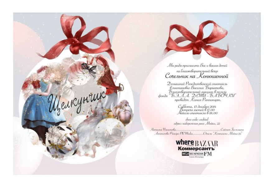 13 декабря, в канун новогодних и рождественских праздников, вновь пройдет «Канун Сочельника на Конюшенной» в отеле «Кемпински Мойка 22». Главное событие мероприятия — благотворительный аукцион, вырученные средства в результате которого поступят на счет фонда «Б.Э.Л.А.». Это частная организация, который представляет и патронирует актриса Ксения Раппопорт, помогает детям с тяжелым заболеванием — буллёзным эпидермолизом. Театральное представление «Щелкунчик» ставит для этого вечера режиссер Василий Бархатов. В числе артистов домашнего спектакля будут: вышеназванная Ксения Раппопорт, Евгения Игумнова, Михаил Татарников, Дмитрий Озерков.Также в программе Сочельника еще одно действо: представление-квест по только что вышедшей книге «Флаурелла. Легкая сила», уже сейчас являющейся одним из лидеров продаж книг для детей. В этом году партнерами Сочельника стали Государственный Эрмитаж, Малый драматический Театр, Театральный музей, Михайловский театр, футбольный клуб «Зенит».