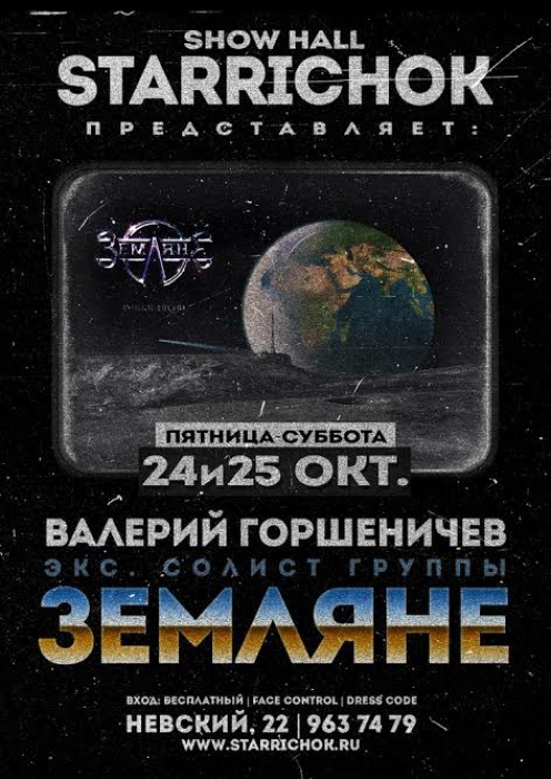 24 и 25 октября на сцене show-hall StarRichOk выступит легенда 80-90-х, экс-солист группы «Земляне» Валерий Горшеничев. С 1986 года он являлся вокалистом группы «Союз», в состав которой входили не менее известные персонади, такие как Виктор Дробыш, Игорь Романов и другие. А в 1991 году был приглашен в качестве вокалиста в группу «Земляне», где и начался его взлет.