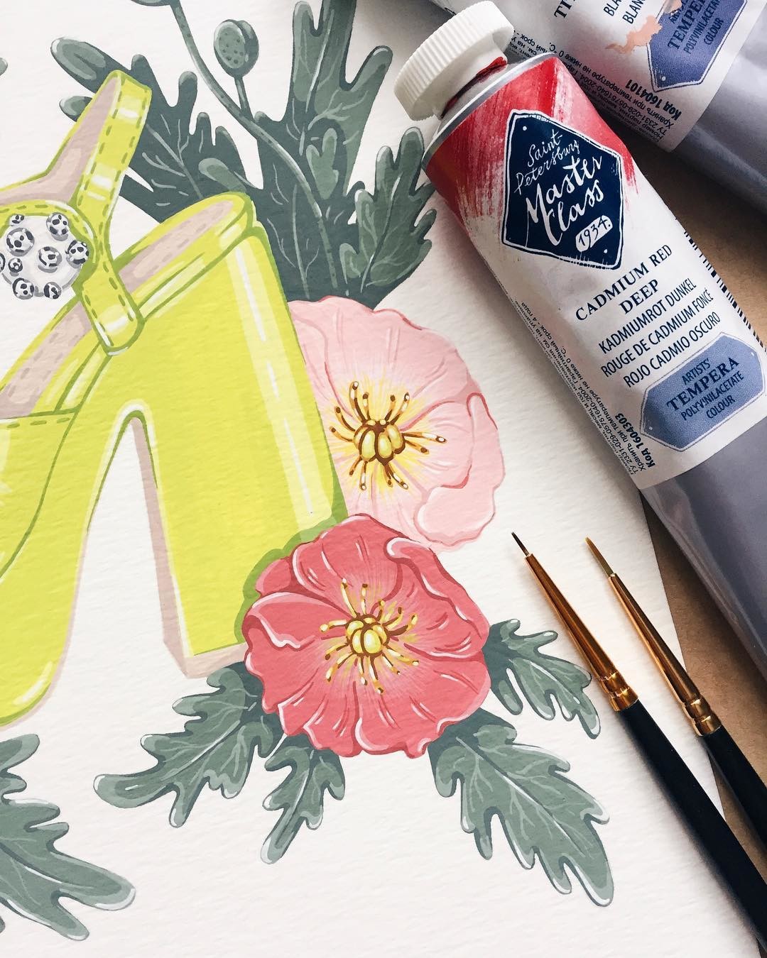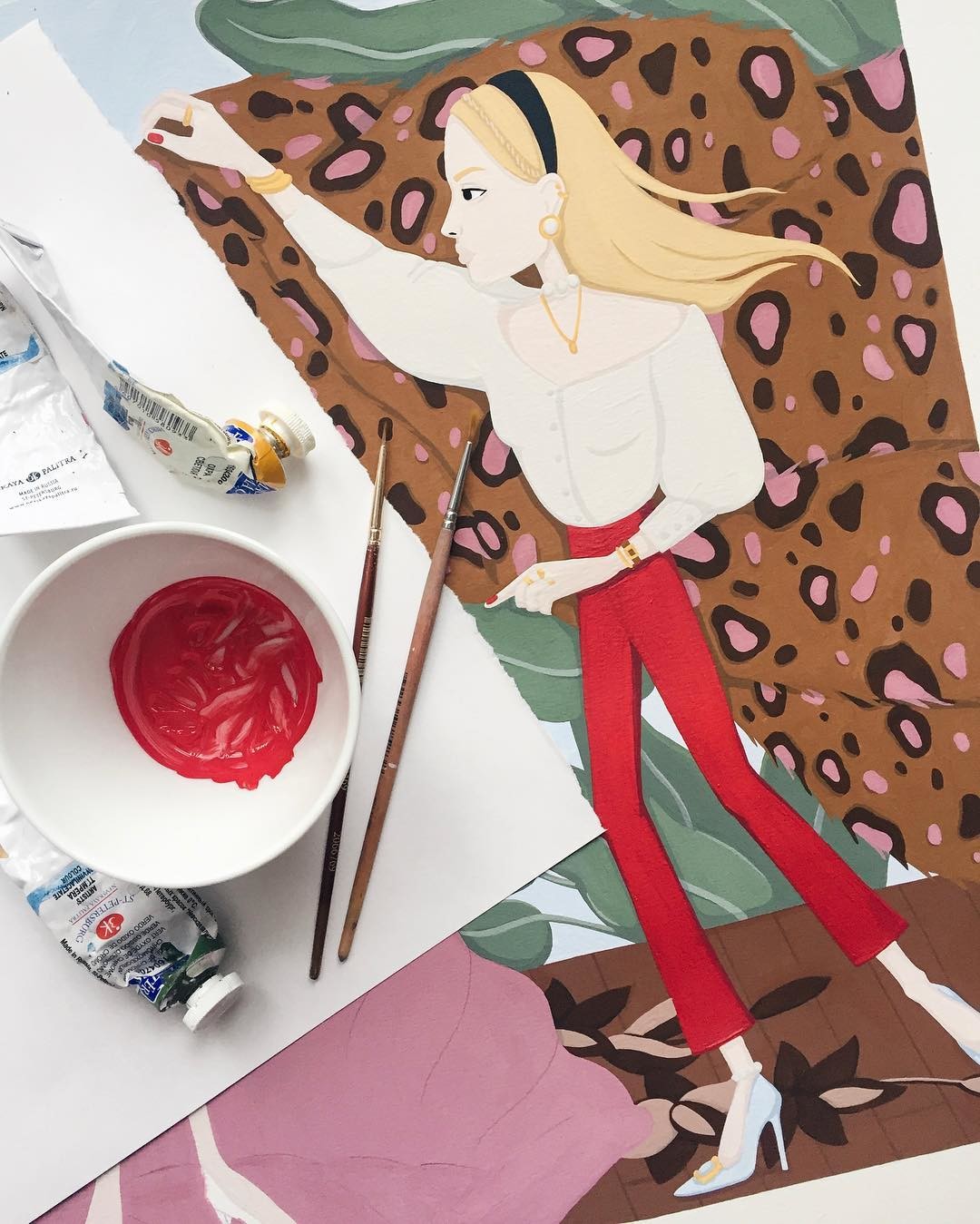 За основу девушка взяла произведения Боттичелли и Тициана, иронично представив образ современного путешественника. Яркие и контрастные иллюстрации, выполненные в технике декоративной живописи темперой, перекликаются по стилю с ее дизайнерскими работами.