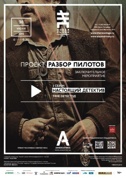 22 июня, в понедельник, в 22:00 на телеканале AMEDIA Premium одновременно с мировой премьерой состоится официальная российская премьера сериала. Читатели «Собака.ru» в рамках проекта «Разбор пилотов» могут увидеть сериал 30 июня на Новой сцене Александринского театра и обсудить первую серию второго сезона сериала «Настоящий детектив» (True Detective) от канала HBO. Модераторы просмотра и обсуждения – ведущие радиостанции «Эхо Москвы» в Петербурге Татьяна Троянская и Александра Петровская.