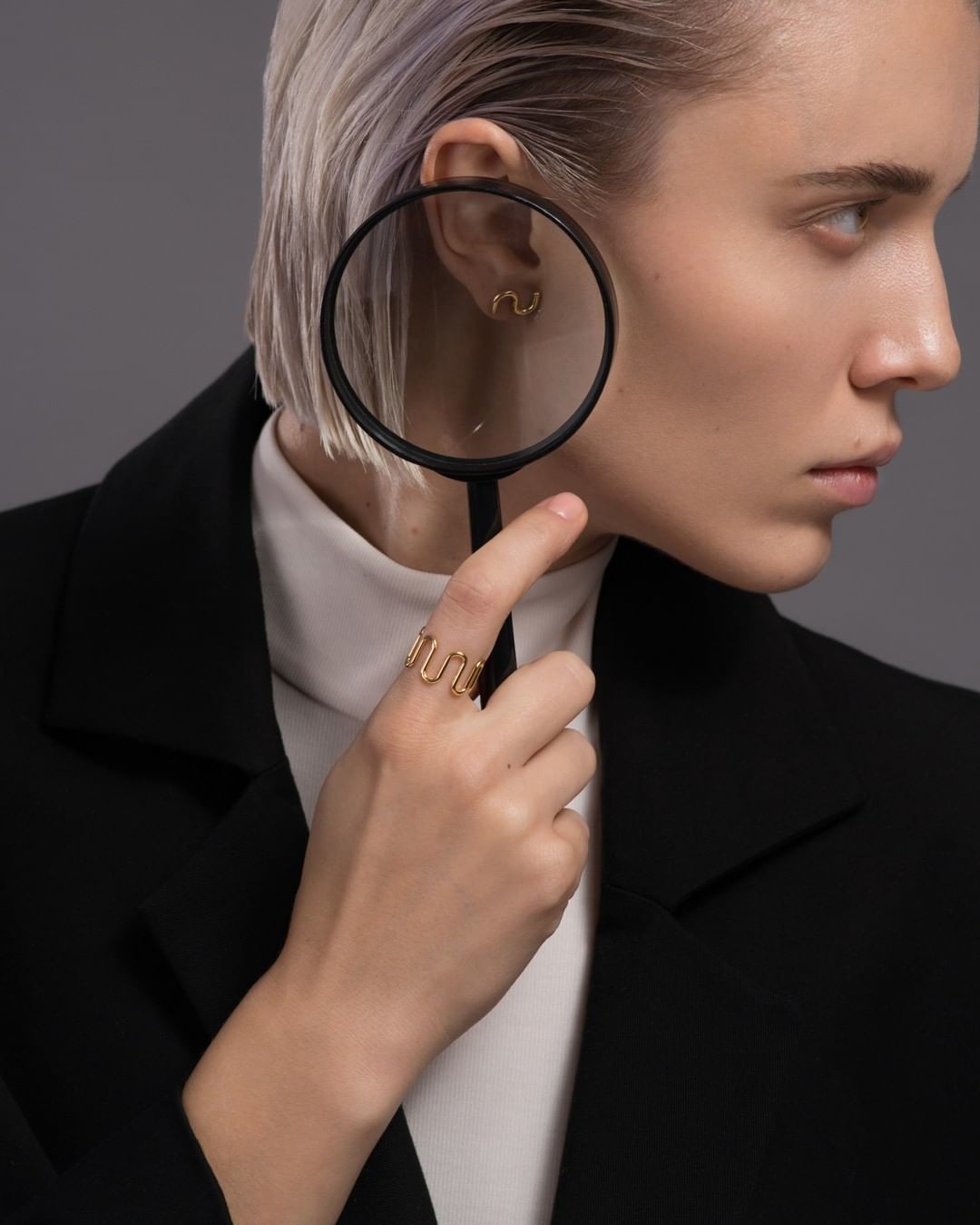 Волнообразные кольца, напоминающие корону, изогнутые серьги-пусеты (проекция нашей жизни со взлетами и падениями), лакончиные пины, которые можно носить сразу по несколько штук и моносерьги из прозрачного пластика стали частью коллекции нового петербургского бренда.