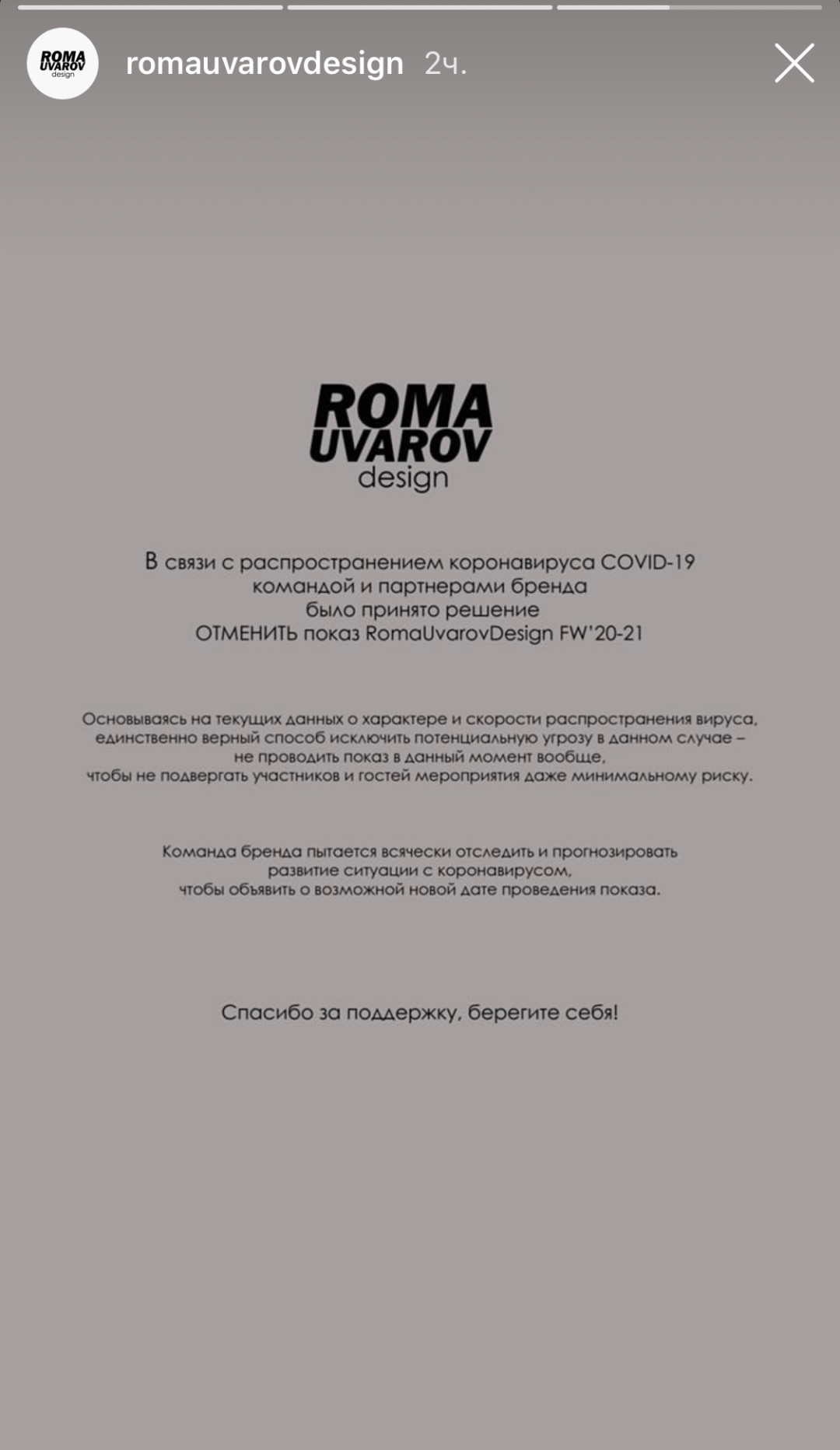 Рома Уваров, победитель конкурса «Собака.ru» «Новые имена в моде» отменил показ коллекции осень-зима Roma Uvarov Design из-за распространения коронавируса. Об этом стало известно из официального аккаунта бренда.