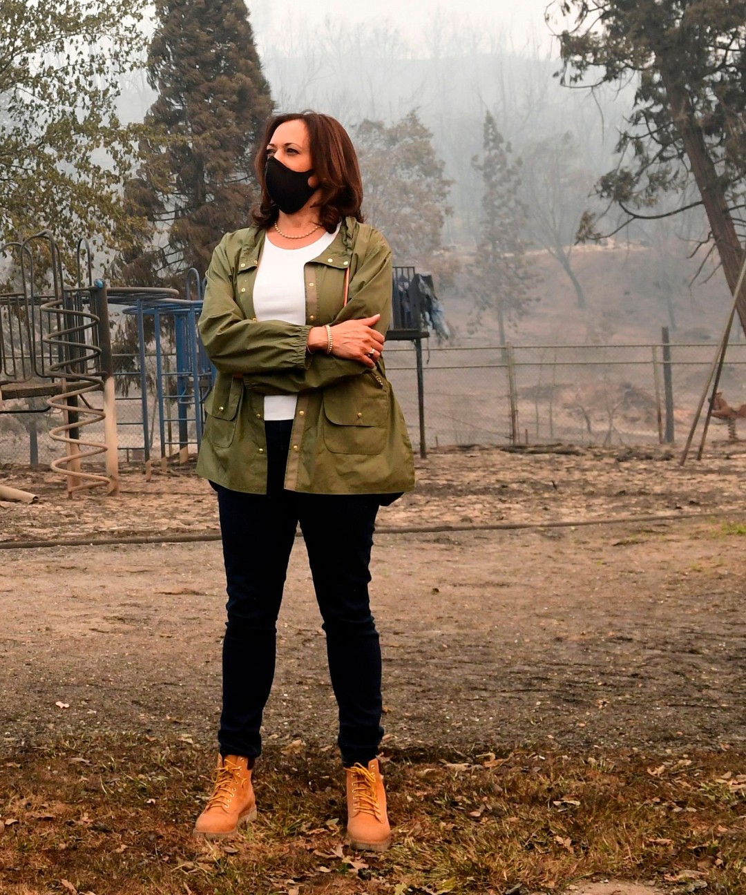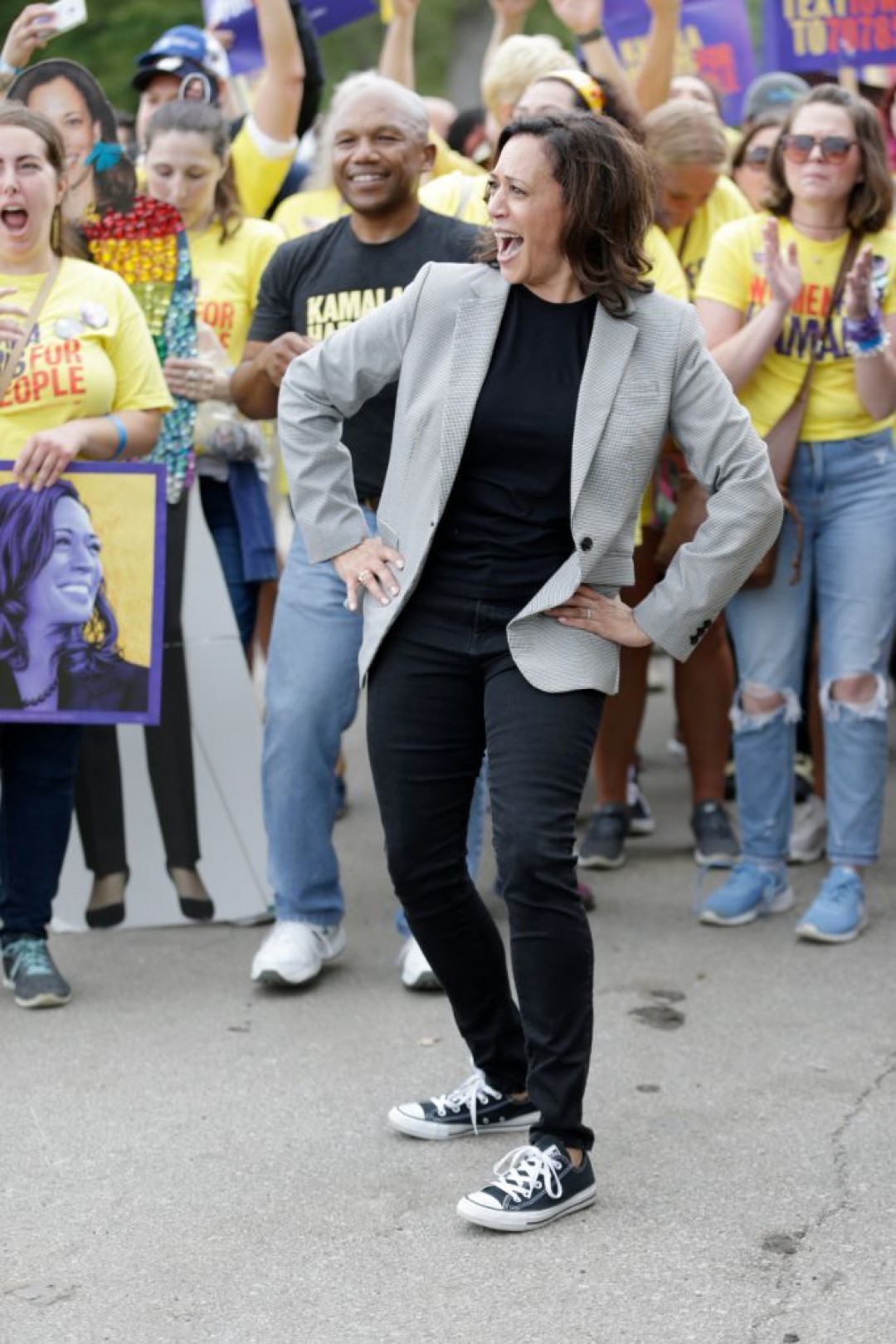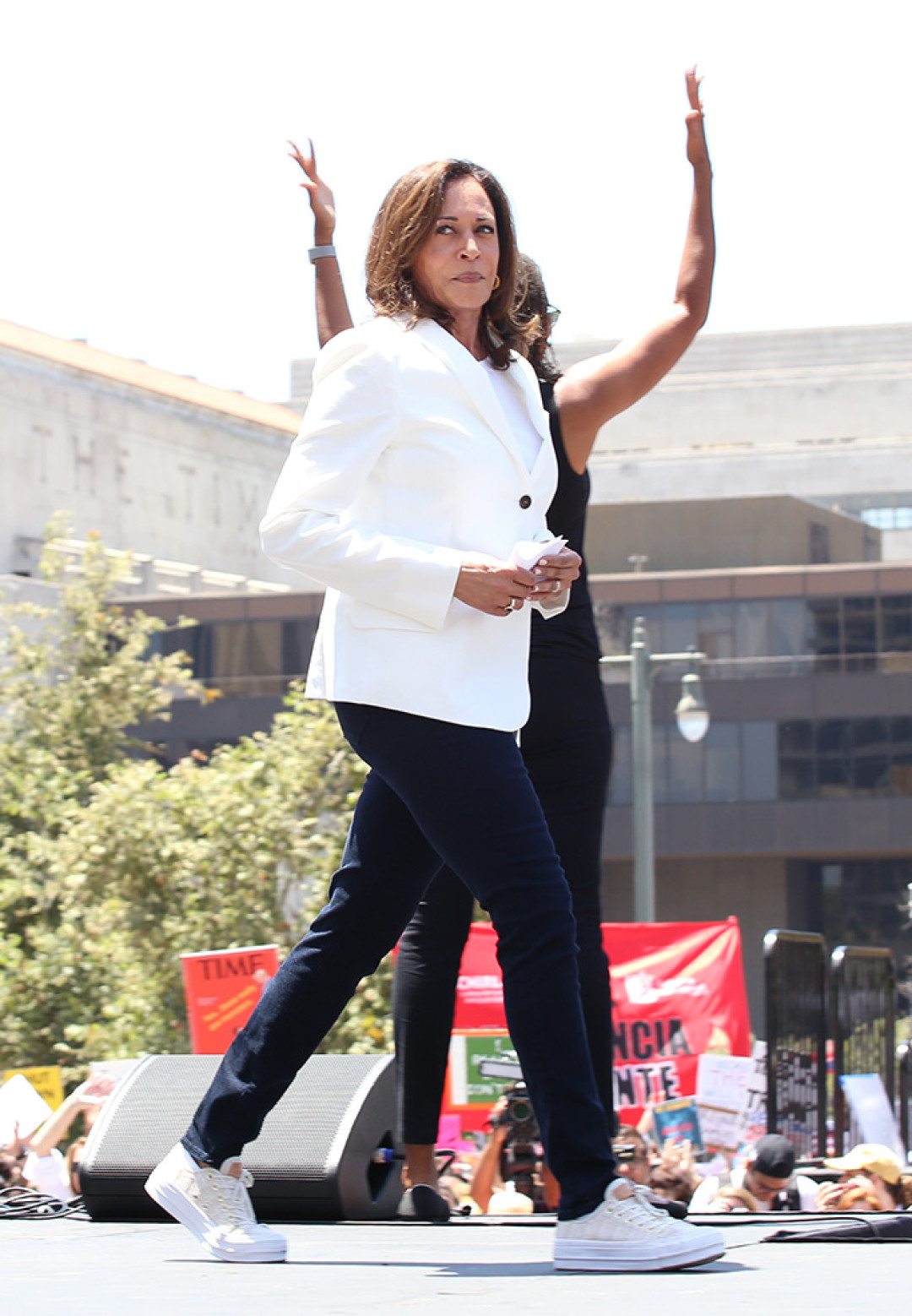 На предвыборном митинге во Флориде Харрис выступала в белых кедах Converse со значками Stop Hate, Save Earth и Vote, созданных американской художницей Ниной Шанель Эбни — одной из активисток движения Black Lives Matter. А во время месяца прайда политик приехала в Сан-Франциско в джинсовой куртке оверсайз с принтом в виде радужного флага из страз. Джинсовку Камала дополнила футболкой также с символом ЛГБТК-комьюнити, белыми джинсами и, традиционно, кедами Converse.