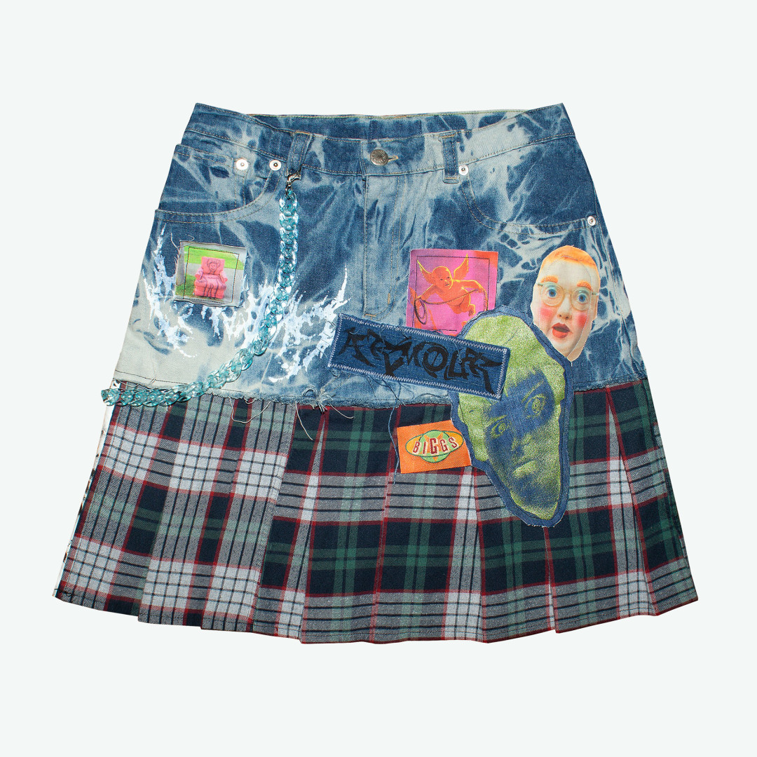 Дима: По тканям: джинса, хлопок, трикотаж, шерсть. В основном плотные и натуральные материалы, которые поддаются окраске, обесцвечиванию и не линяют. А если по предметам, то как-то мы купили коробку очень странных игрушек с кучей бирок. Задействовали и игрушки — украсили ими жилет, и бирки — превратили их в принты.