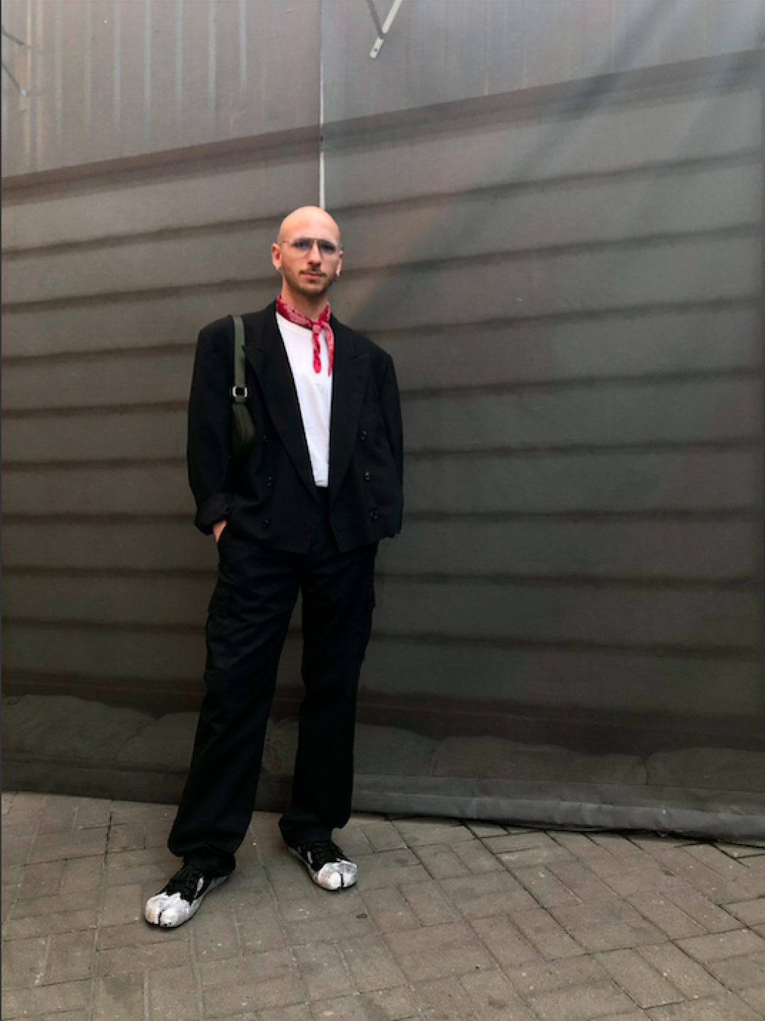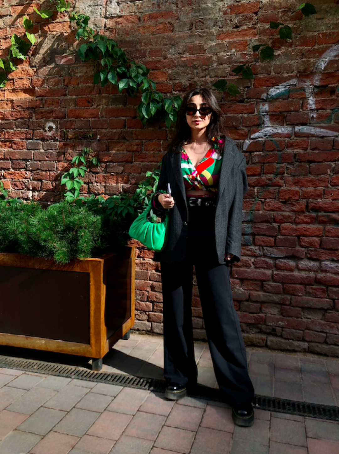 Брюки Bershka, ботинки Dr. Martens, винтажный пиджак, рубашка Lime и сумка JWPEI. Очки и украшения ноунэйм.