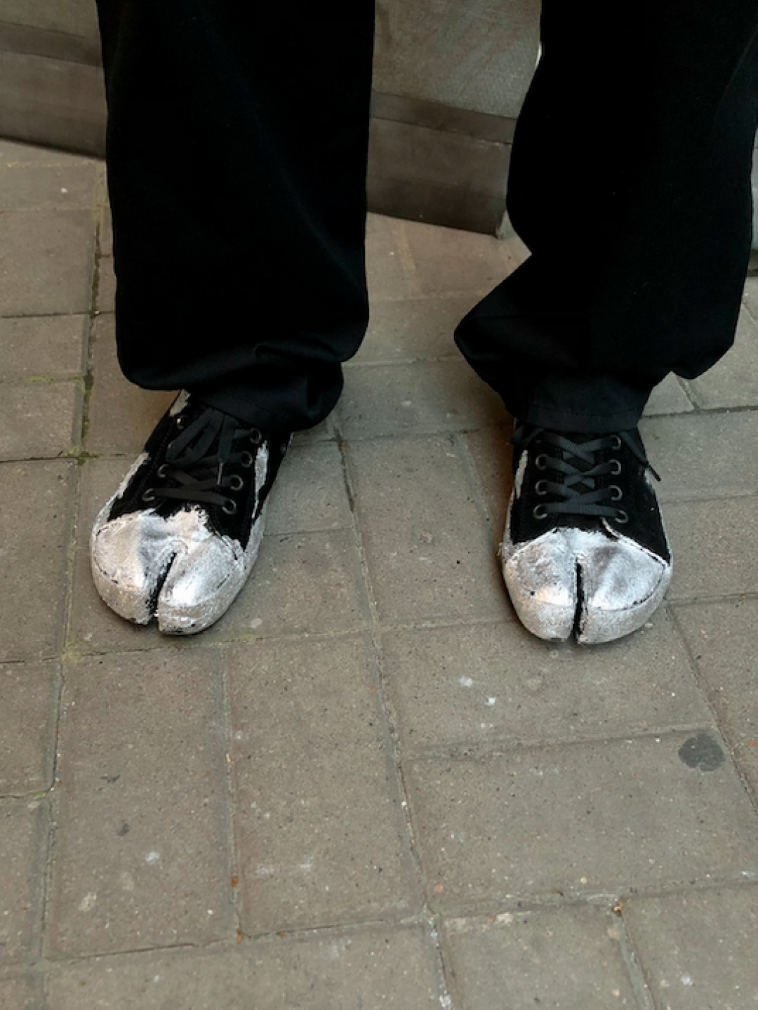 Обрезанный двубортный пиджак и брюки с Уделки, бланковая футболка H&M, сумка Befree, платок Zara, кеды-таби Maison Martin Margiela, очки винтажного (ныне не существующего) бренда James Tart, серьги Avgvst.