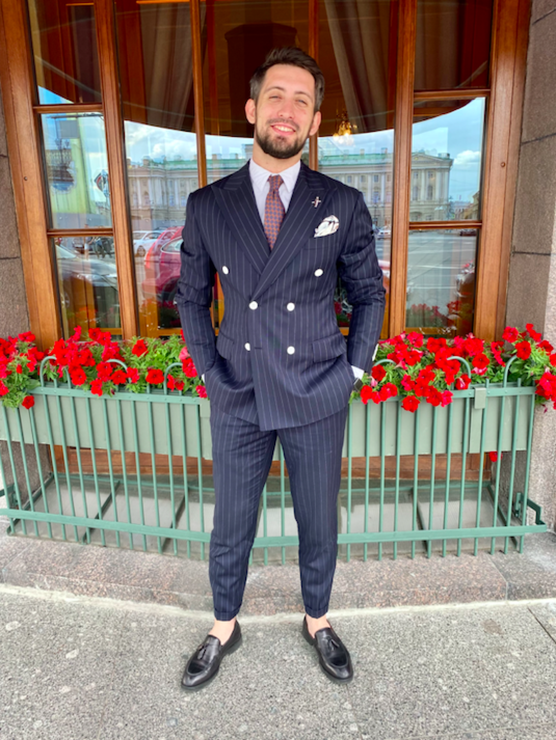 Костюм, сшитый на заказ в Gents Atelier, и итальянские лоферы.