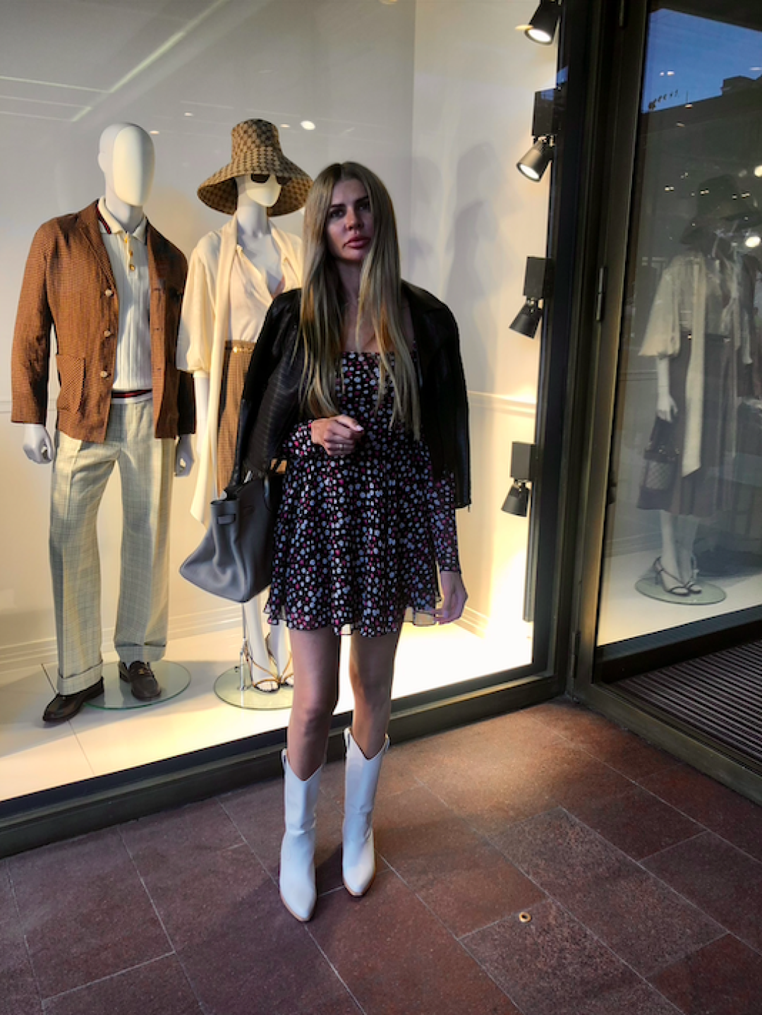 Кожаная куртка Drome, платье и сапоги Toptop, сумка Hermes Birkin.