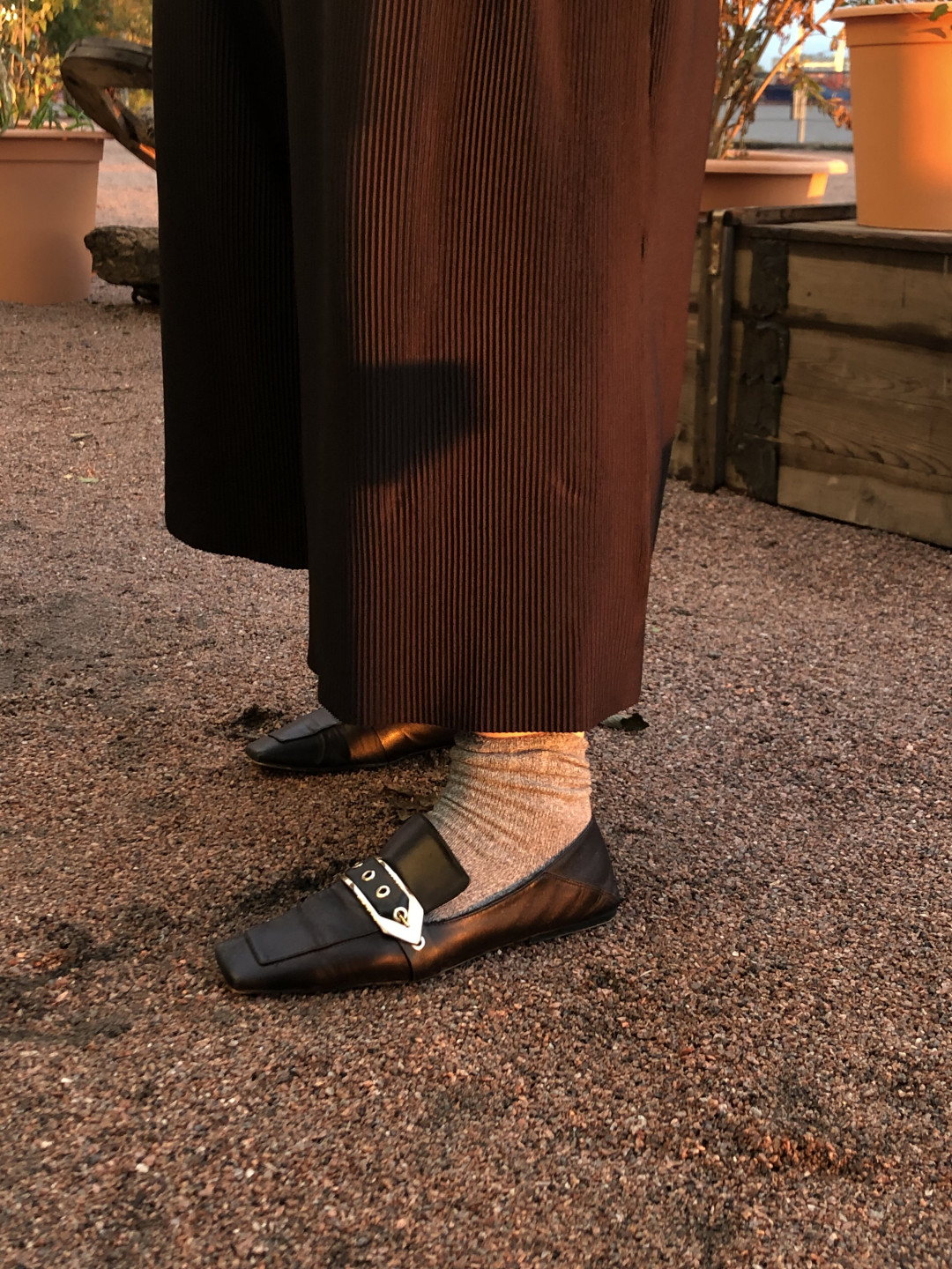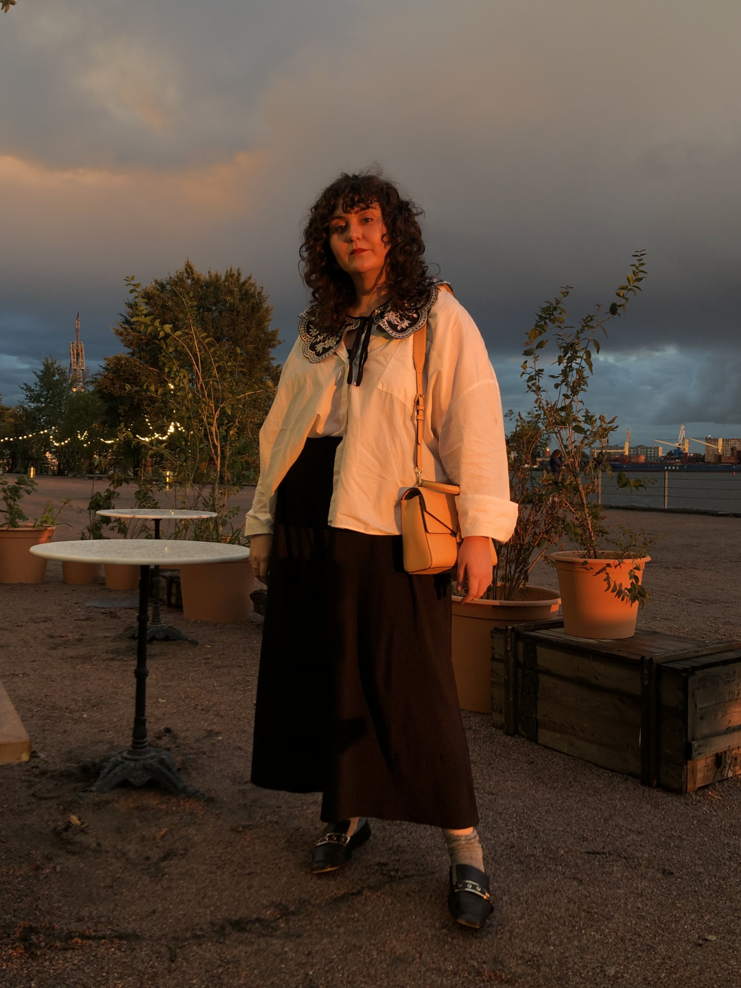 Лук в школьном стиле: рубашка и брюки Asos, лоферы Zara, воротник no name, носки Unique Fabric, сумка Michael Kors, серьги винтаж, кольца Avgvst.