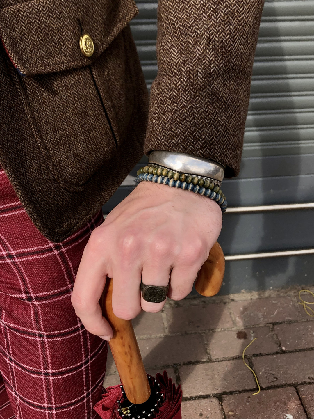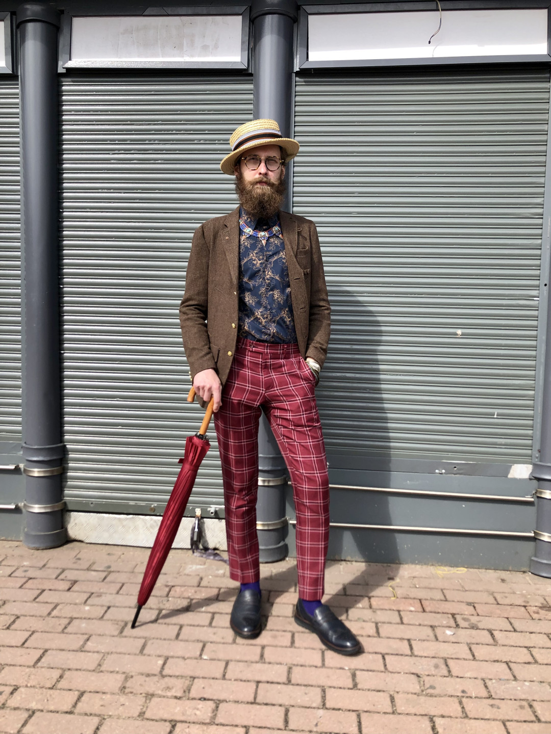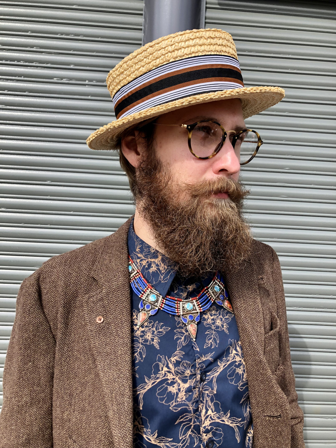 Куртка а-ля императорская охотничья, подаренная другом, штаны от подруги, рубашка no name, лоферы из Петербурга, шляпа-канотье и непальское колье.
