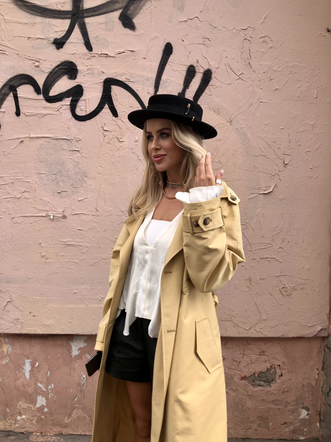 Ботинки Bottega Veneta, плащ Studio 29, блуза H&M, кроп-топ Ushatava, шорты Uterque, сумка Zara Home, шляпа Baginskiy.