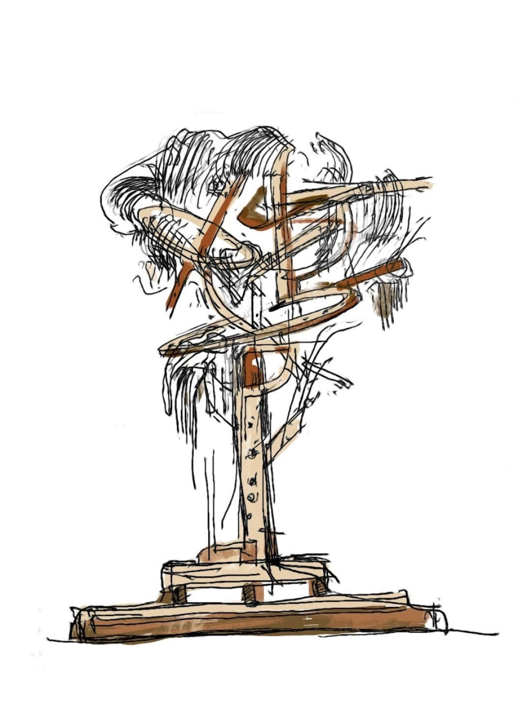 Каркас скульптуры собран из найденных деревянных остатков производства. Текстильные элементы также были найдены на Электрозаводе в Москве, где находится моя студия. Во время мастер-класса мы вместе с участниками покрасили тряпичные элементы натуральными пищевыми красителями в природные цвета и дополнили ими каркас скульптуры.