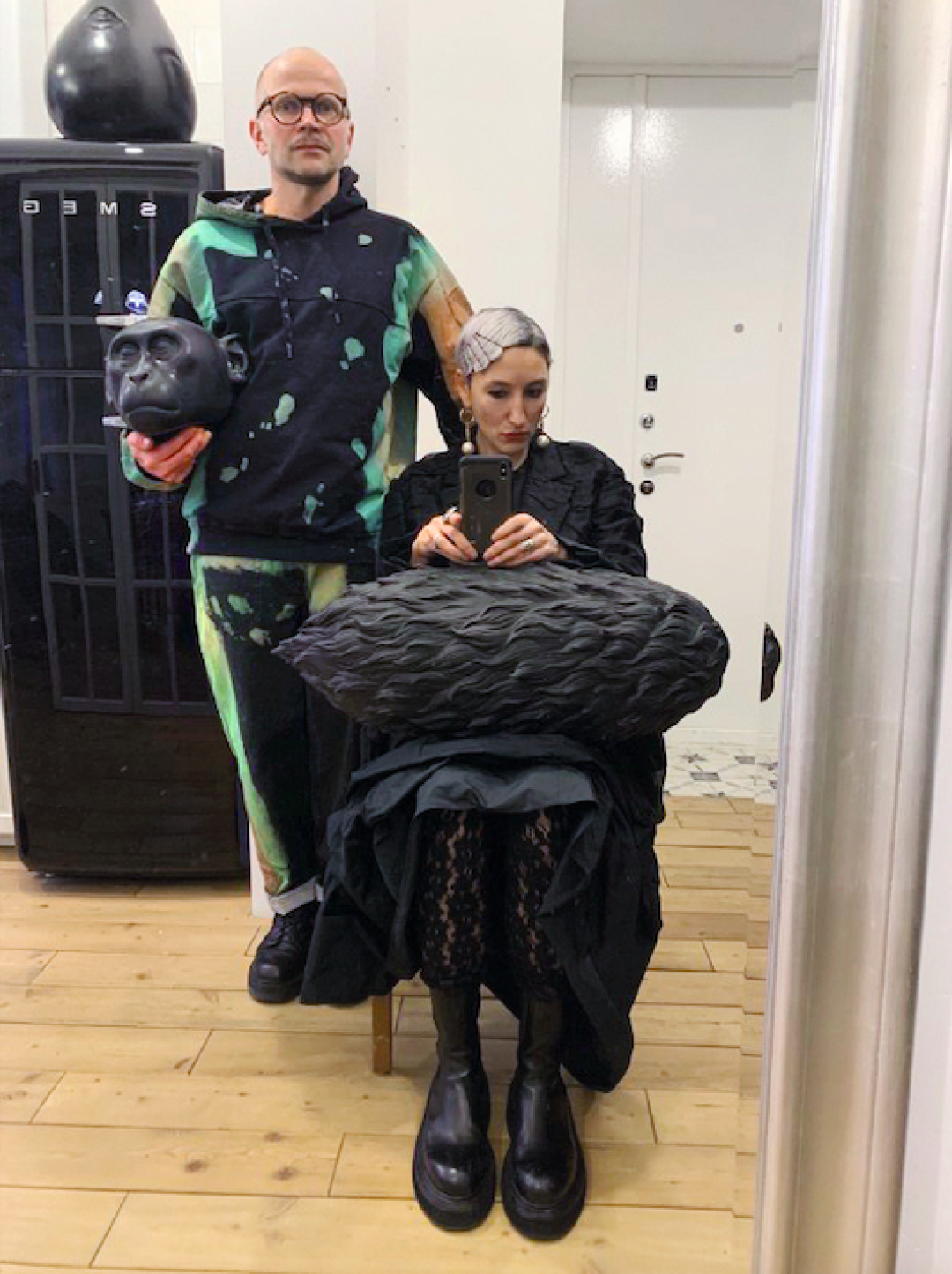 Декаданс, романтизм, деконструкция и конструктивизм — пожалуй, так можно описать стиль скульптора и художницы. Скульптуры Прасолова мы готовы носить на руках, а вот работы Пивко уже можно примерить — недавно Наталья начала делать ткани с принтами своих работ.