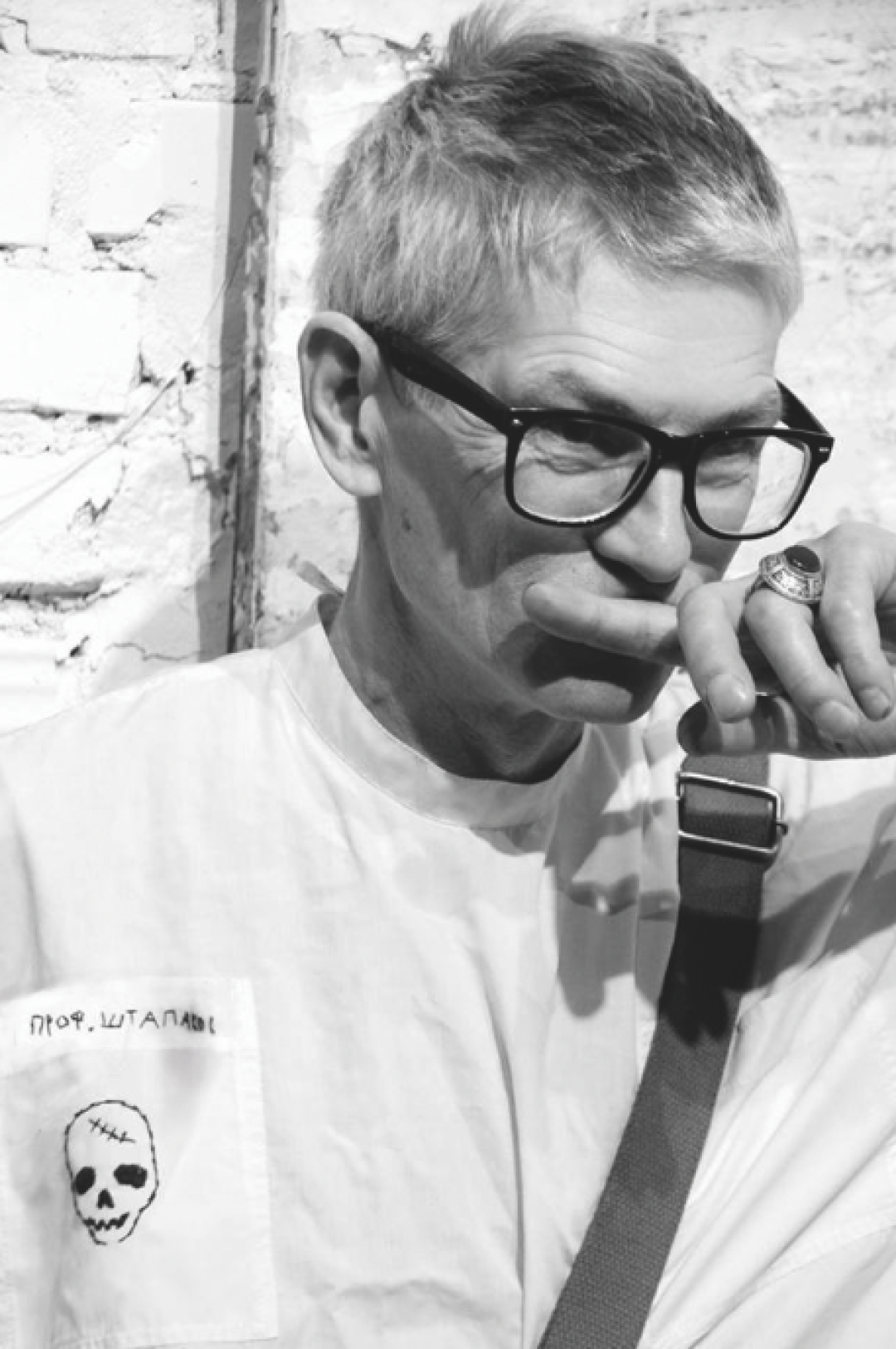 «Сейчас мало кто из моих друзей выражает себя через одежду — время маргиналов прошло. Одеваться как фрик — это мне помогает жить. Сканируя пространство вокруг себя, художники редко выделяются одеждой, они отличаются от остальных чем-то другим. Художники — маленькие генераторы,которые реализуются в творчестве, им не нужна подпитка из внешнего мира. Кстати, поэтому петербуржцы особо не уделяют времени своему внешнему виду — они не провоцируют пространство, чтобы от него заряжаться. Я ненавижу магазины: беру вещи у друзей, многое мне просто дарят. Люблю вещи с историей: на мне сейчас, например, повязка отца. Как-то я делал картины из железа, остался обрезок материала — из него я сделал корону. Или попадает ко мне в руки теплая синяя рубашка, морская, и хочется мне к ней чего-то морского добавить. Может быть, мину, а может, и рану вышить, похожую на женский половой орган. Сам я не вышиваю, просто придумываю, а реализацию доверяю своим приятельницам прекрасным. Как паучок плетет паутинку — футболки и свитера у меня примерно по такой технологии получаются».