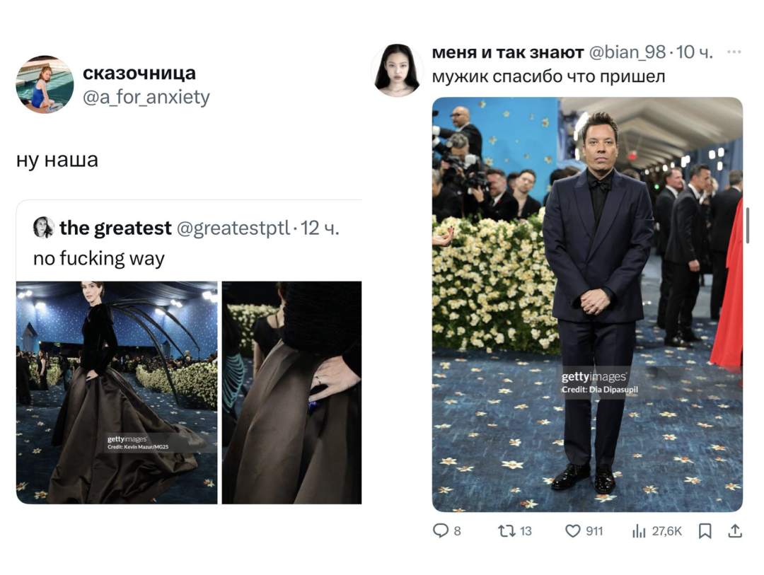 Главный фэшн-мем вечера — платье-галстук Thom Browne, ставшее лучшей версией себя благодаря Деми Мур. Пока Рианна поднимала рождаемость, а Зендея косплеила Ирину Винер, рэпер André 3000 выступил в жанре «рояльчик в кустах». Ну а медиаблогер Хаби Лейм внимательно следил за таймингом!