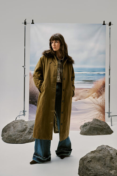 Идеальный рецепт для медитативной прогулки у Финского залива: плащ с меховой оторочкой, уютная рубашка в клетку, джинсы-клеш и томик Бродского.