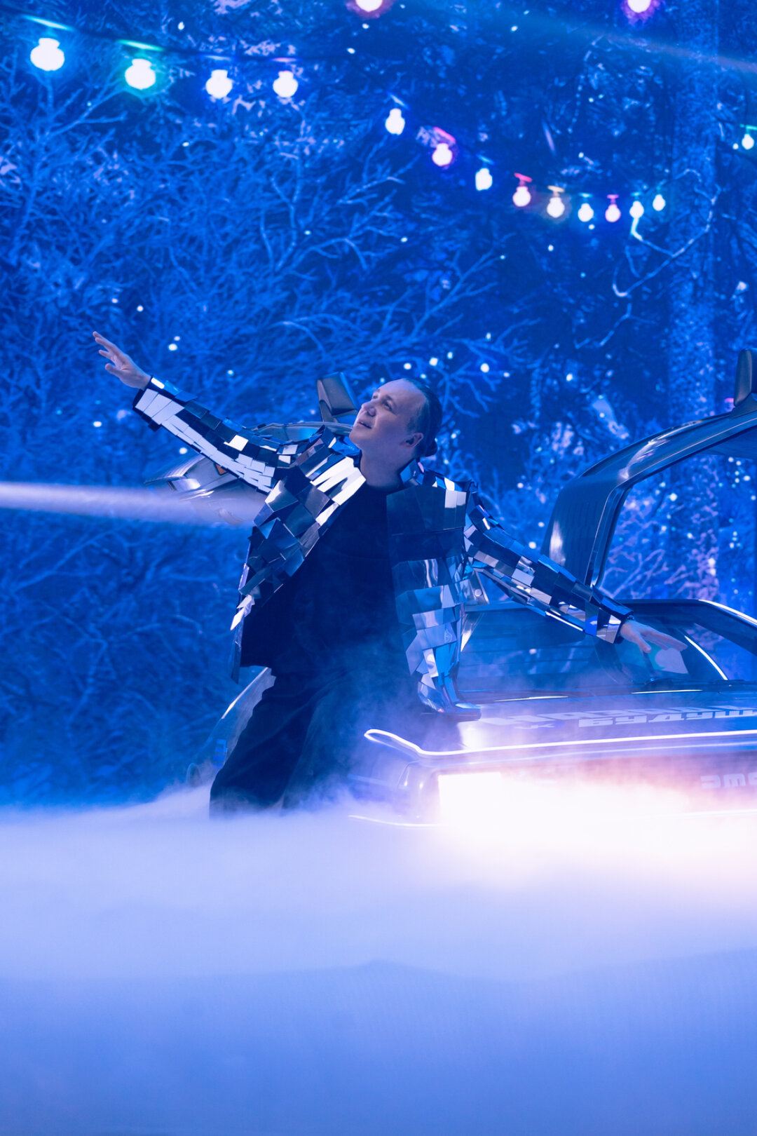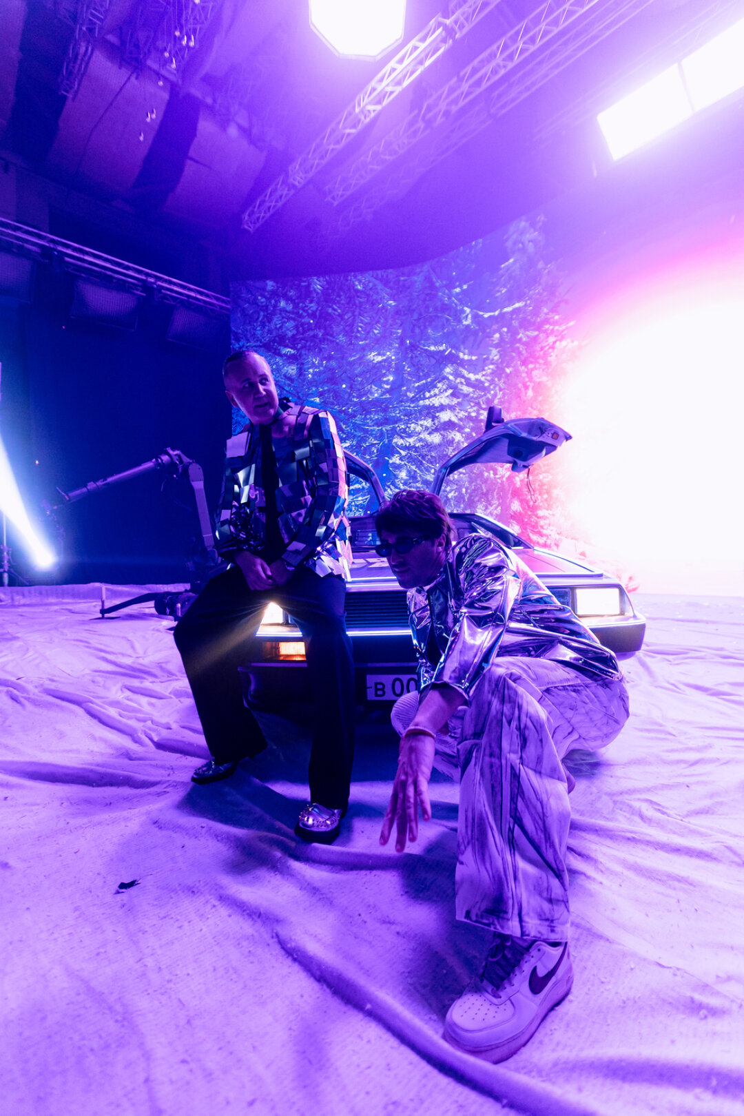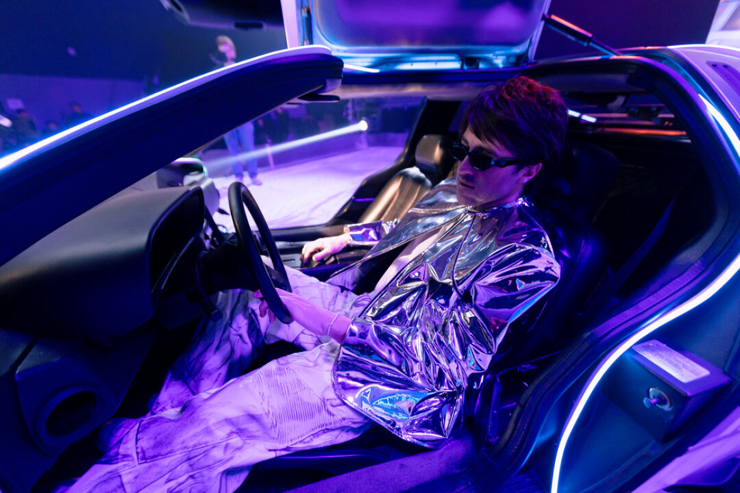 В дуэте Blizkey и солиста группы «Динамит» образы выстроены именно вокруг серебра, показывая, насколько гибким стал этот тренд. Илья Зудин одет в зеркальный жакет, собранный из металлических фрагментов в духе ретрофутуризма: серебро здесь про праздник, иронию и визуальный шум, который идеально вписывается в новогодний контекст. А Blizkey показывает другую версию тренда через глянцевую серебристую куртку, более утилитарную по форме. Это streetwear-интерпретация металлика, где блеск встроен в повседневный силуэт. Именно в таком формате серебро окончательно перестает быть вечерним клише и становится частью современной городской моды.