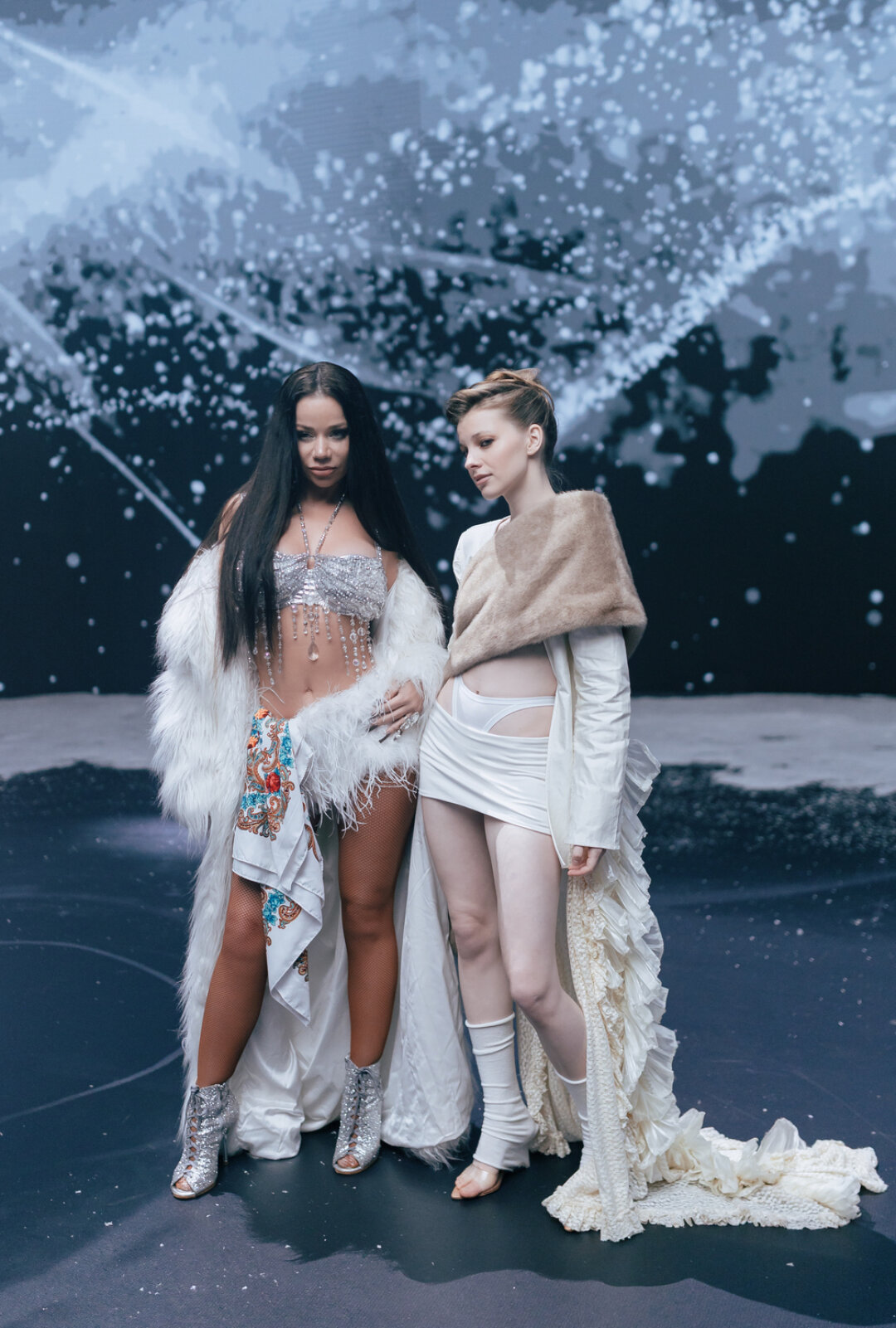В луке певицы Бьянки мех становится частью сценического образа. Белоснежная пушистая фактура усиливает ощущение фантазийности и звездного выхода «вне времени»: образ рождается на стыке поп- и Y2K-эстетики и клубной роскоши. Здесь мех подчеркивает хрупкость силуэта, контрастирует с блеском и телесностью и добавляет нарочитой избыточности, благодаря которой и запоминают яркие сценические образы.