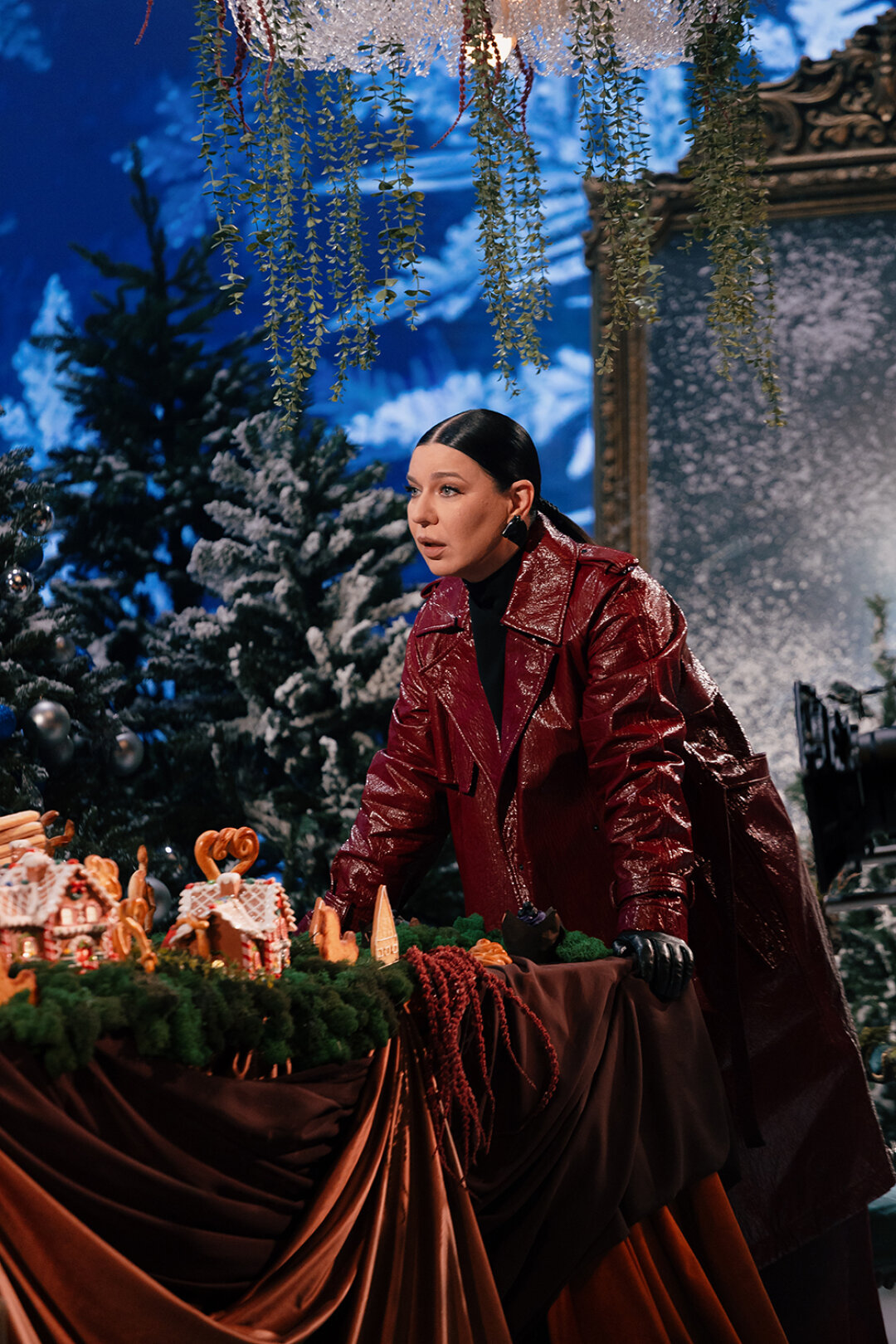 Этой зимой красный и его оттенки уверенно закрепились в street style и подиумных коллекциях — от вишневого до алого (можно встретить в коллекциях осень–зима разных брендов, от Tom Ford до Avavav) — и все чаще работают не в качестве стандартного «платья на выход», а точечным акцентом. В том числе для верхней одежды. Такой образ мгновенно обретает драматургию, даже если остальной аутфит достаточно минималистичный и одинаково подходит как для вечерней прогулки, так и для новогоднего ужина. Пример — лук певицы Елки. Черный монохромный образ усложнен тренчем насыщенного красного оттенка, который выделяет исполнительницу на фоне праздничных декораций.