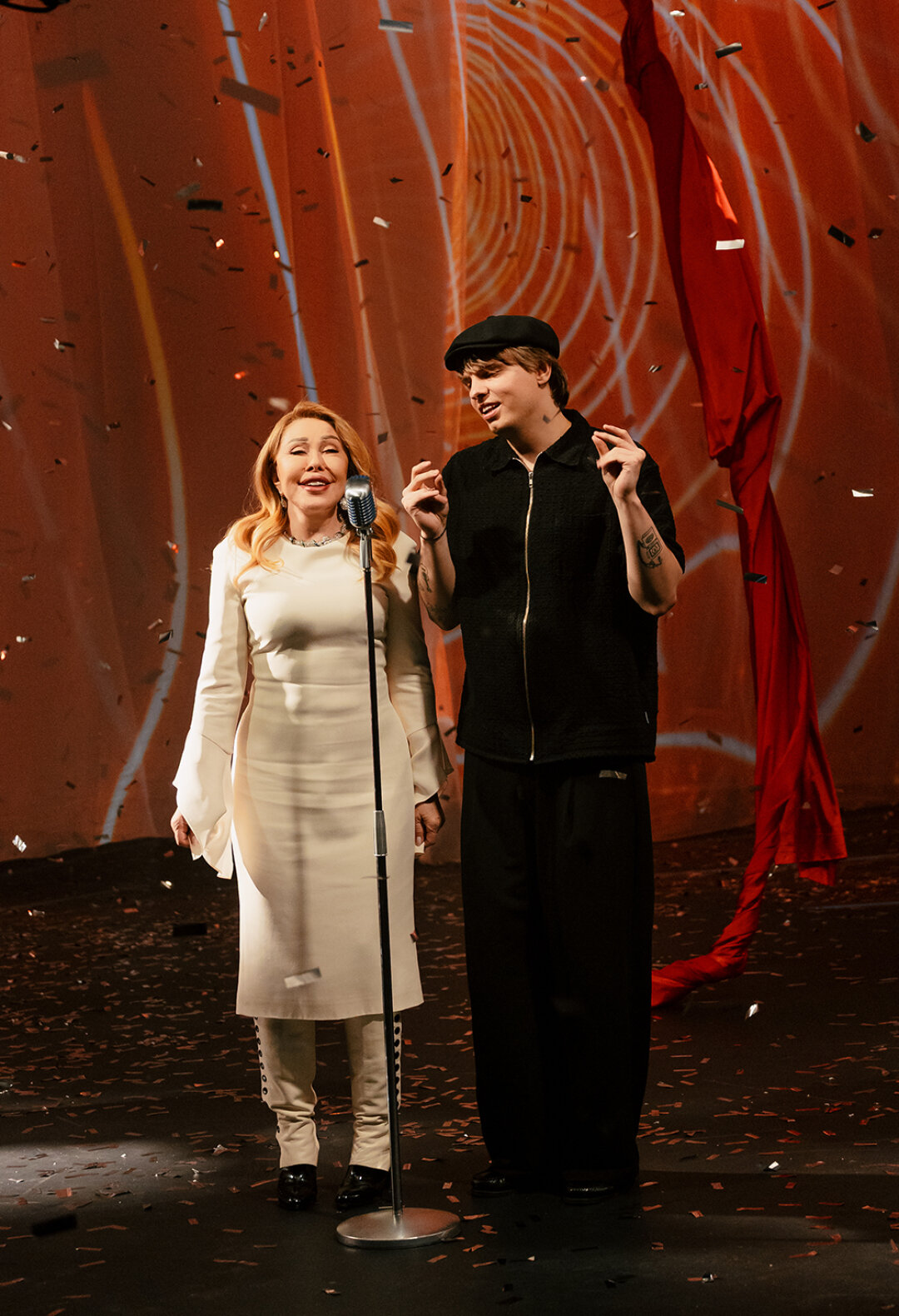 В дуэте Любови Успенской и MAYOT монохромность считывается сразу в двух разных интонациях. Образ певицы — мягкий, светлый total look, где оттенки молочного работают как символ элегантности и вневременной женственности. Здесь монохром подчеркивает не форму, а настроение: чистоту, атмосферу момента, камерность — все внимание фокусируется на образе.
