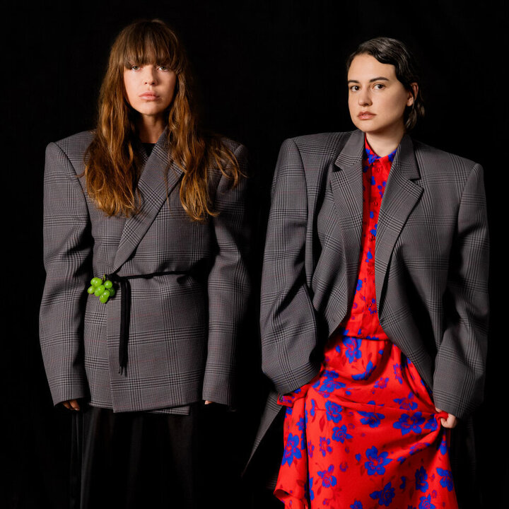 На Марии: серьги POISON DROP, платье NEEGOOSH, перчатки SOFYA TIKHONOVA, головной убор AVAIIA На Александре: рубашка TPY, пиджак TPY, очки SAINT