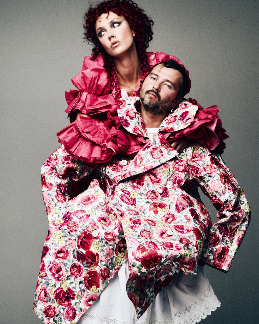 Лучшее празднование годовщины свадьбы — восхитительная фэшн-съемка уровня Стивена Мейзела и Патрика Демаршелье, как бы намекают топ-стилисты Миша и Китти (в ответе за наряд Марии Миногаровой на московской свадьбе в «Метрополе», вау-луки Ксении Собчак и поп-инфлюенсера Марго Овсянниковой, а также за стайлинг модного дома Alena Akhmadullina). Юбилейный wedding anniversary отметили в цветовом каноне розовой свадьбы — в розах и рюшах Comme des Garçons, дополненных деконструированными рубашками, кожаными куртками-трансформерами и хардкорными трензелями. Съемку доверили только виртуозу арт + фэшн-фотографии Максиму Чуркину (автор обложек Собака.ru с Паулиной Андреевой и Елизаветой Базыкиной!), с которым сложили идеальное творческое трио (вместе снимали кампейны для 1811, Viva Vox, Secrets и чего только не!).