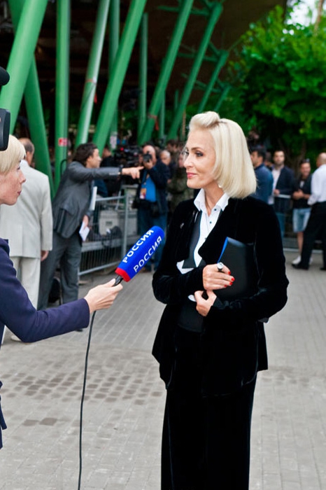 Мужская сорочка, как и другие вещи на манер мужских, уже давно перекочевали в гардероб Вайкуле. Она надевает белую или голубую рубашку прямого силуэта всегда — и на открытие «Новой волны», и просто с тренировочными штанами для прогулок по прибалтийскому побережью.