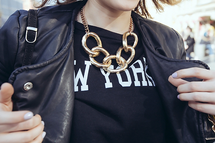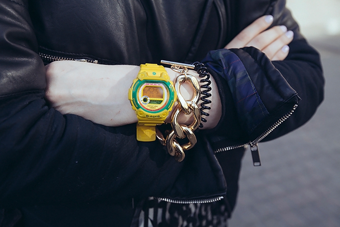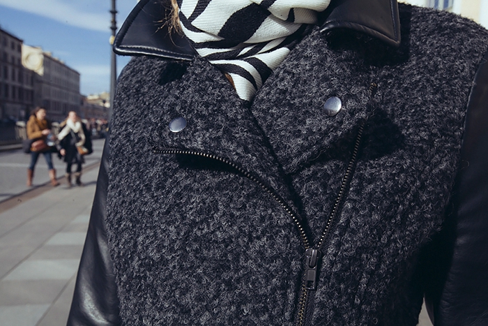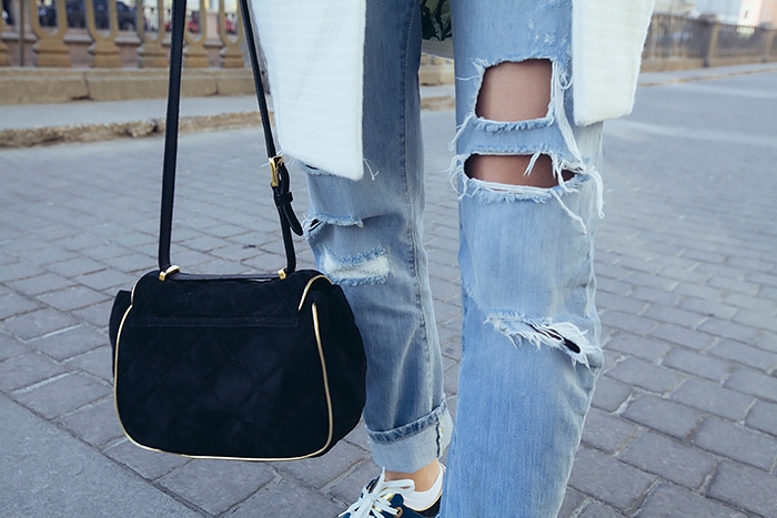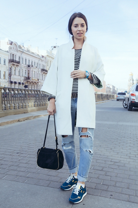 джинсы и пальто Zara, кеды Louis Vuitton, часы Marc by Marc Jacobs, сумка Moschino