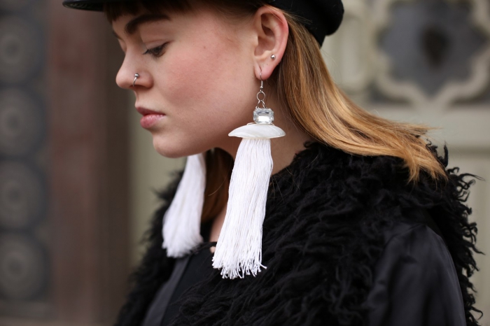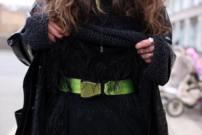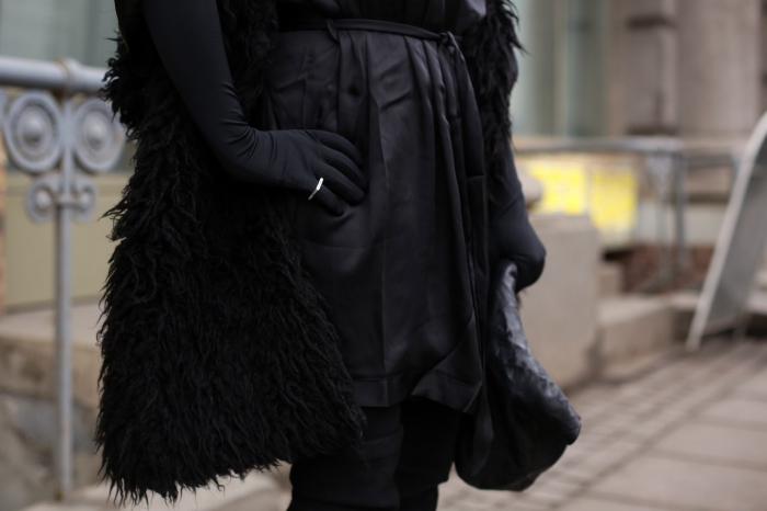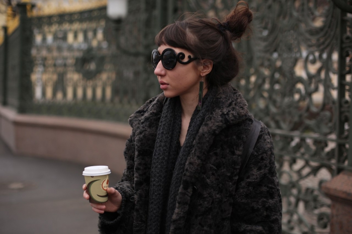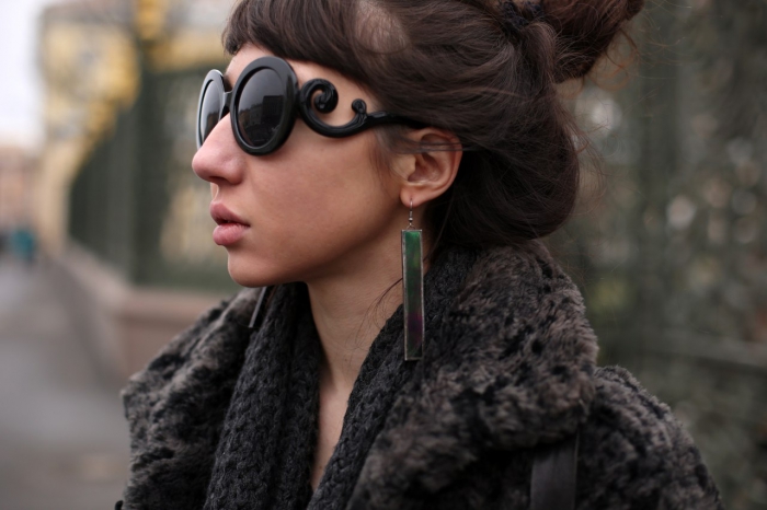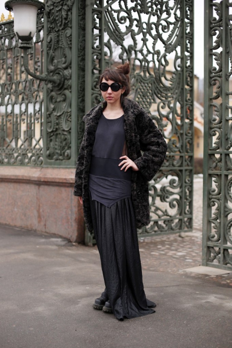 На Юле: платье White.Trash.for.Cash подарили ребята из магазина «Мыльная Белка», шуба и кардиган из секретного секонд-хенда на Литейном проспекте, в котором всегда полно сутенерских шуб по 300 рублей, а ассортимент обновляется каждые 5 дней, рюкзак из магазина «Антресоль», ботинки Camelot, серьги by Irina Neilo, очки Seppala.