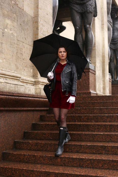 На Марине: куртка-косуха и винтажное бархатное платье из Episode shop в Амстердаме, Hunter boots купила в Венеции, перчатки — подарок подруги из Берлина.