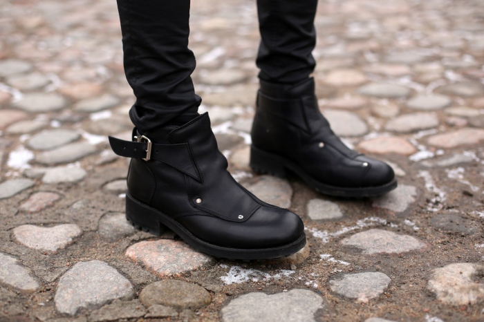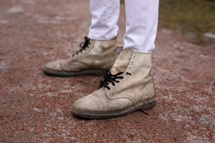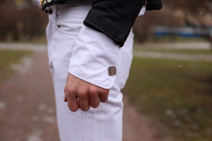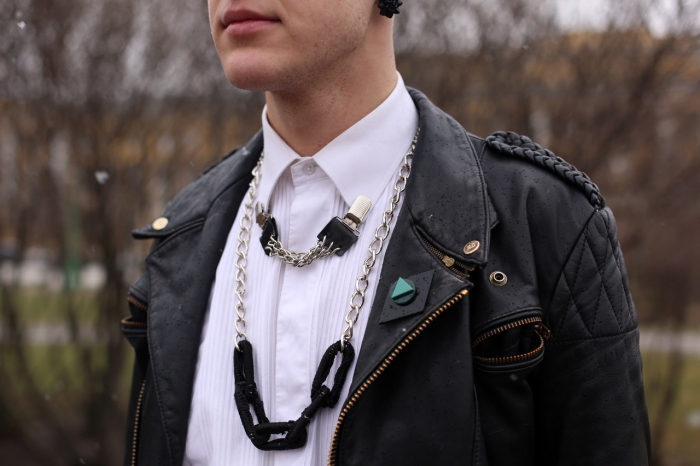 На Викторе: ботинки Dr. Martens, джинсы Wood Wood купил в Берлине, сорочку Frederik Theak — в Стокгольме, винтажная косуха из Берлина, украшения хэнд-мэйд — подарок подруги, цепь на воротничках — подарок подруги.
