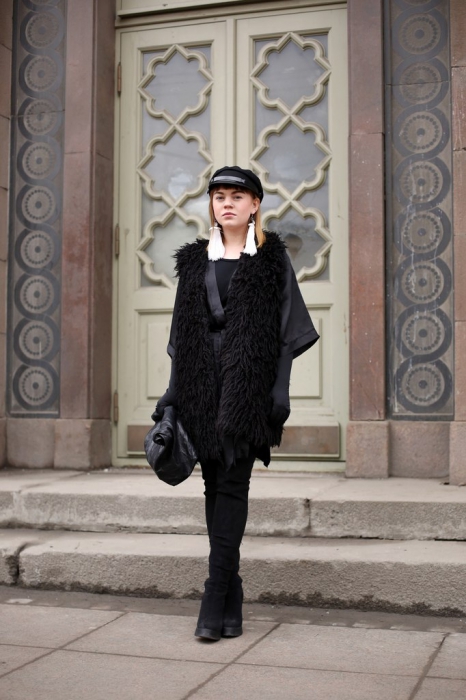 На Ане: жилетка и блузка (укороченный халат из отдела домашней одежды) из H&M, ботфорты Miista куплены в магазине Даши Миловидовой Nevalenki Concept Store, фуражка из секонд-хэнда Room Store, сумку сшила сама, лекалом послужил обычный бумажный пакет.