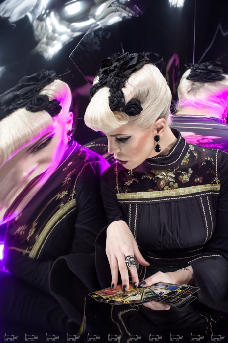 Шляпа, чокер, боди, юбка и пояс Arsenicum by Dmitry Loginov (шоу-рум Apartment 26), серьги Ellen Conde (шоу-рум Apartment 26), кольца H&H (Air), вуаль