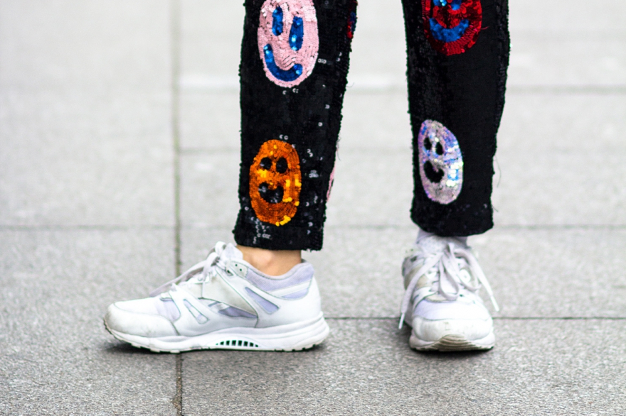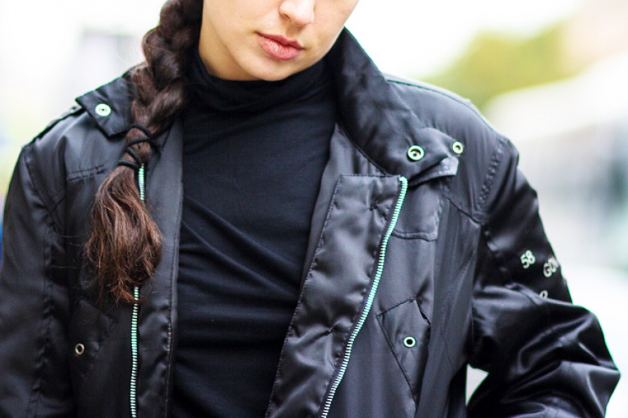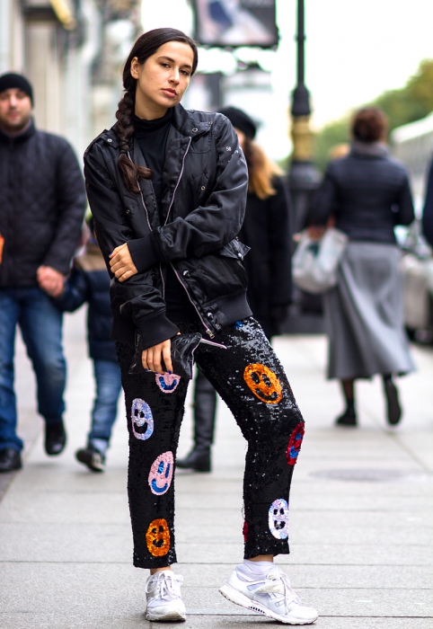 На Олесе: брюки Ashish x Topshop, бомбер из секонд-хенда «Мегастиль», водолазка Uniqlo, кроссовки Reebok, кошелек Kokosina