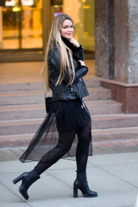 На Наталье: платье Zara, косуха Jean Paul Gaultier for Lindex, сумка Rebecca Minkoff, ботильоны Zara