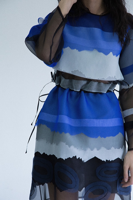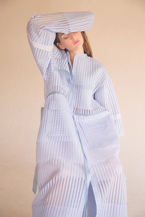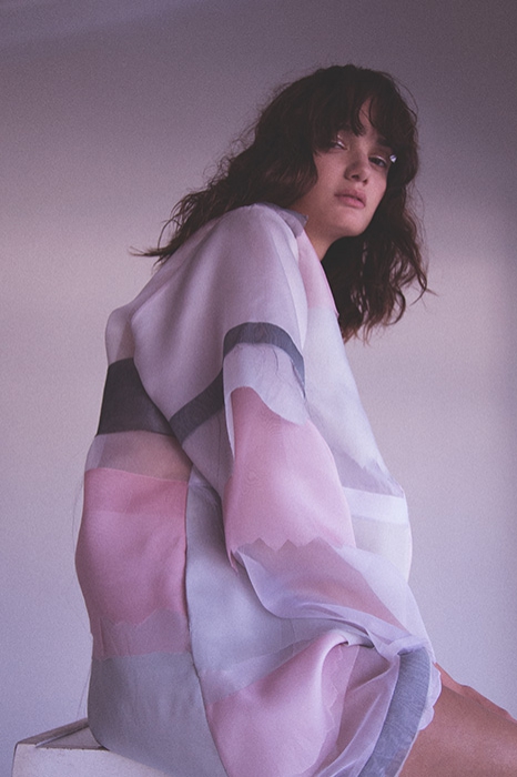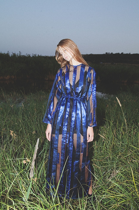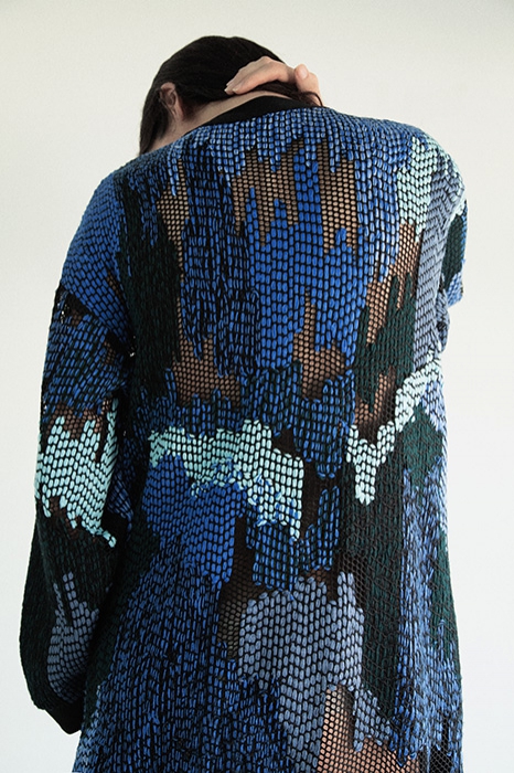 Ручная работа — это ДНК моего бренда: вышивки, перфорация на искусственной коже, пэчворк — каждый раз мы пытаемся пробовать новые техники или трансформировать знакомые приемы. Новый семпл я оттачиваю из множества идей, и это приносит мне огромное удовольствие. У меня в ателье работают десять мастеров и еще несколько человек занимаются вязаными вещами. Мы вырезали цветы, из которых потом складывали юбки и бомберы, вручную создавали сложные, абсолютно симметричные паттерны на коже в первой коллекции, а в этом сезоне самыми сложными оказались вышивка и вырезка по шелковой органзе: разноцветные многослойные надрезы создали пейзажи ночных гор. Основная часть коллекции — платья в этой технике, колористика и переход линий напоминают о лунных пейзажах, череда свет лых и темных слоев создает ощущение глубины и напоминает тени, а яркие металлические линии, контрастно выделенные из палитры, похожи на освещение улиц, светящие фары машин, неоновые вывески на мотелях или свет окон как в работах американского фотографа Тодда Хидо. Ночные пейзажи, человеческие тела, любовь, одиночество, мистика и повседневная красота как на снимках Райана Макгинли, Нан Голдин, Юргена Теллера и Джефа Броуса стали темами сезона. Я пытался использовать техники, которые позволили бы луку ассоциироваться с ночью, чтобы ткани выглядели как тени. Светлые версии напоминают рассветные часы. Светло-голубые вещи из органзы в полоску, смешанные с белым цветом, развивают тему сна. Спортивным бомберам и принтам я придал классические формы, а по том подверг деконструкции. Из-за того что раньше я занимался живописью, для меня очень органично работать с цветом, он помогает мне создавать особую энергетику. Это нетипично для Грузии, где дизайнеры просто обожают черный цвет, потому что местная культура более глубокая и темная, чем, например, европейская. В Тбилиси меня вдохновляют андеграундные места, постсоветские районы и работы художника Карло Качаравы.