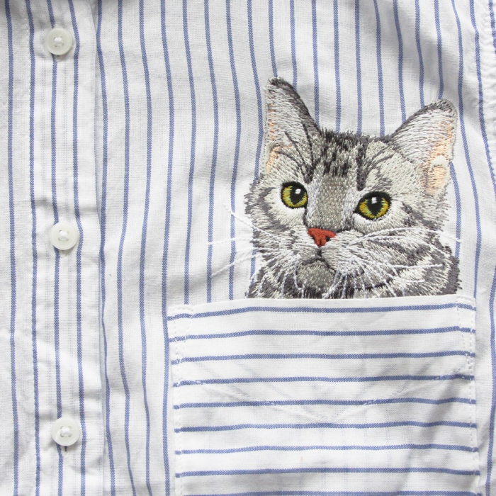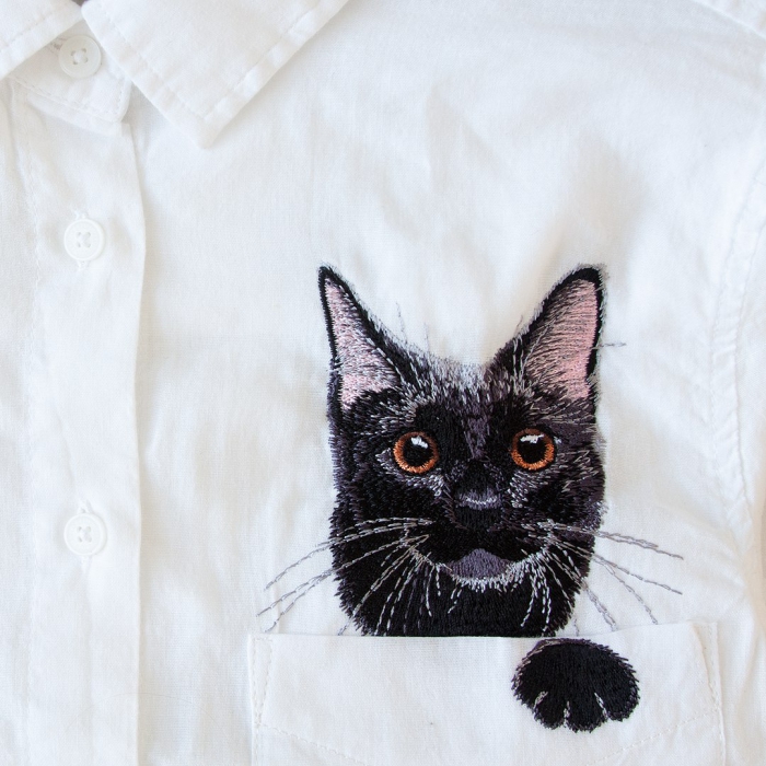 Идею выглядывающего из кармана рубашки кота мы подсмотрели у японской художницы Хироко Куботы. Она прославилась тем, что задорого вышивала гладью на заказ по фотографии домашнего любимца. Такую работу нужно было ждать минимум полтора месяца. Мы решили, что немного изменим принцип: договорились с питомниками, и те прислали нам изображения своих чемпионов, как нам писали, «лучших из лучших котов». Самым сложным этапом оказалась разработка авторского дизайна: коты должны были получиться предельно реалистичными.