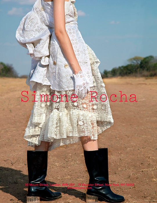 Модель из Петербурга Вика Павлова стала лицом рекламной кампании Simone Rocha. Снимки в Замбии сделала фотограф Джеки Никерсон, которая известная своими фотоисториями о Африке.