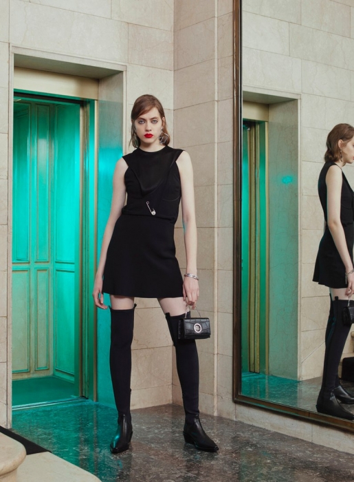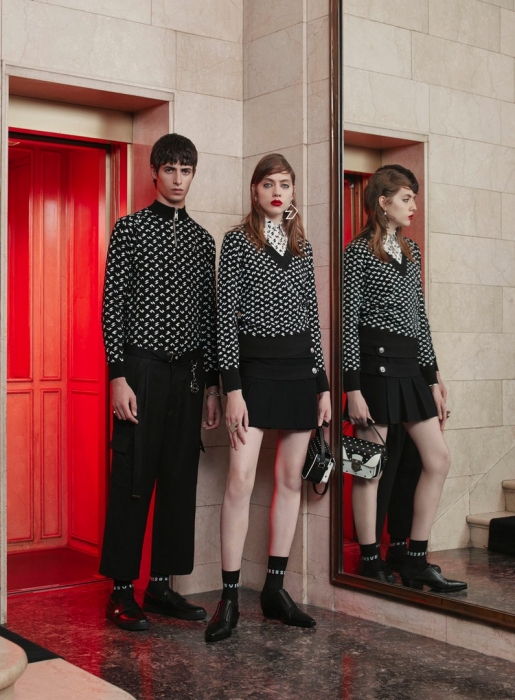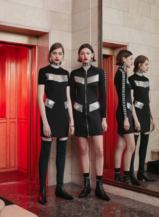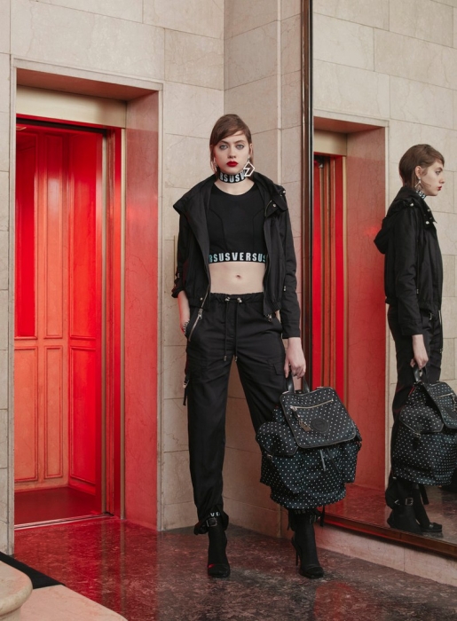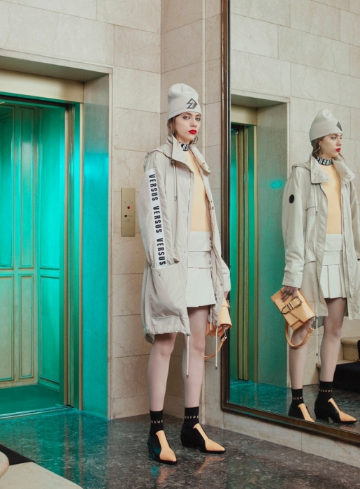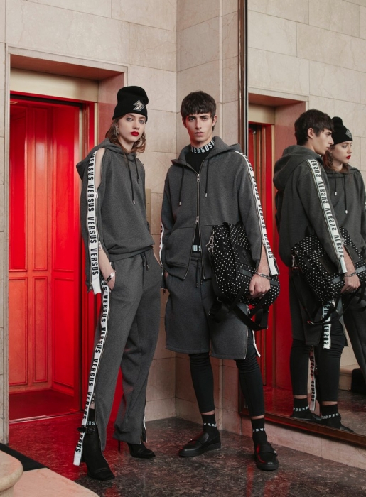 Из лукбука Versus Versace можно позаимствовать приемы стайлинга: например, сочетание велосипедок с худи, миди-юбки с длинной толстовкой или ботфортов с мини-платьем.