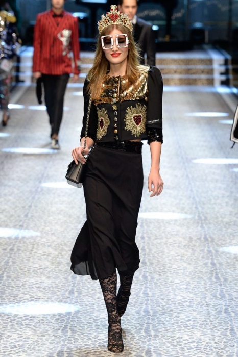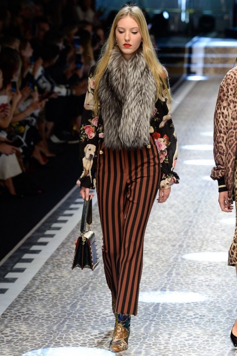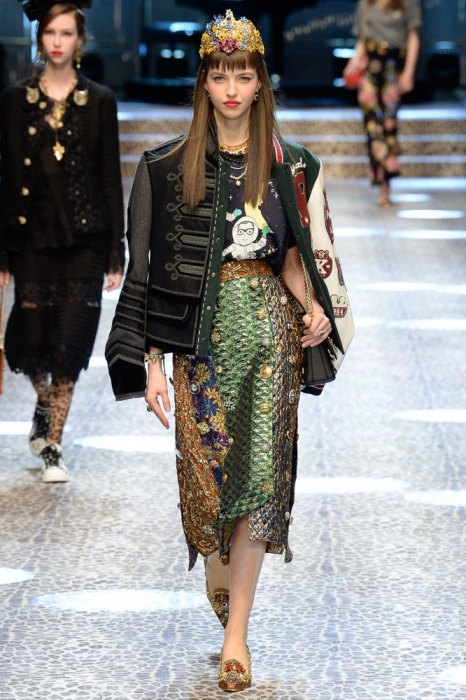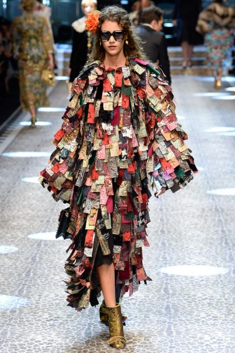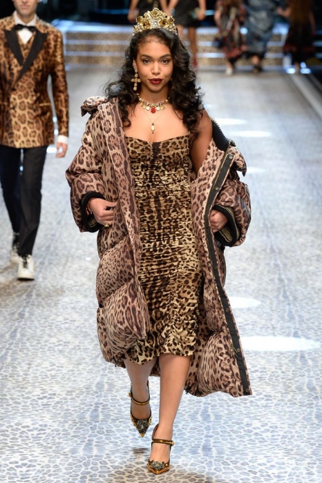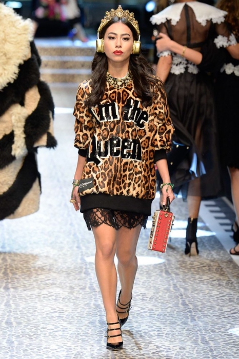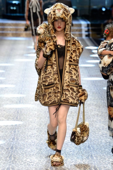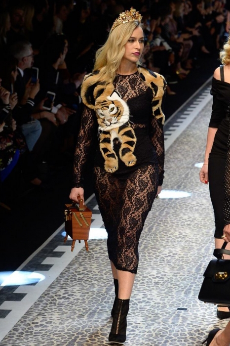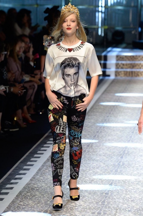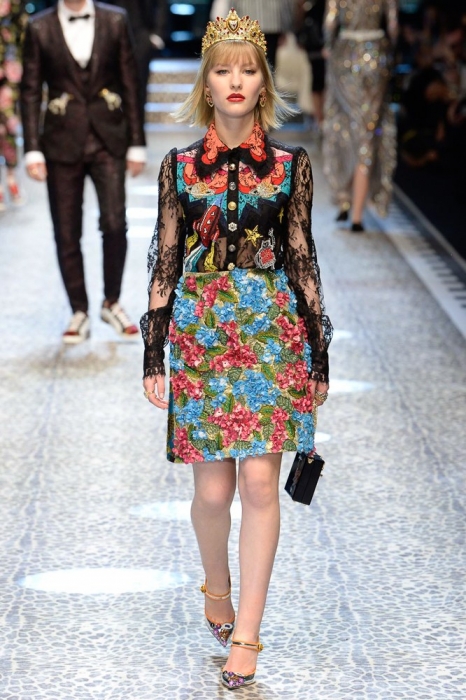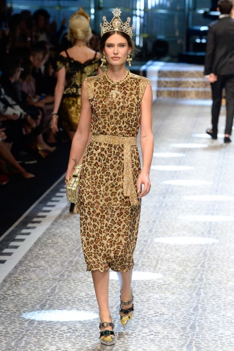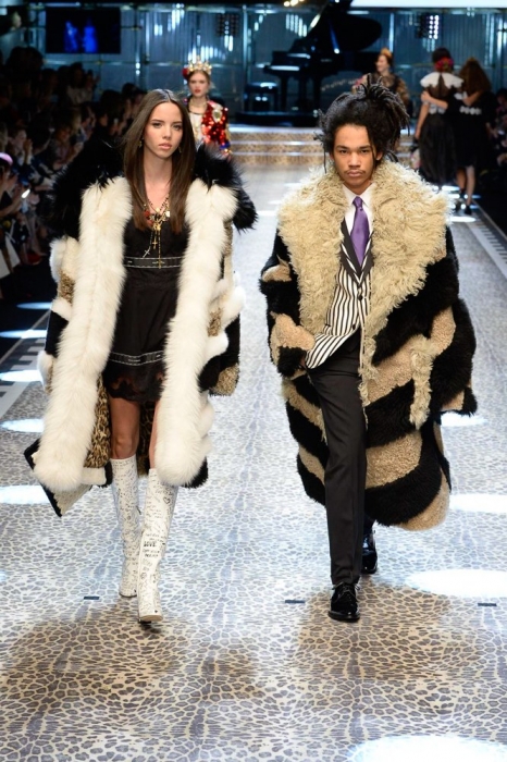 На показе в Милане были показаны почти все коды, которыми эксплуатирует марка начиная с восьмидесятых годов: много леопарда и цветов, сицилийских орнаментов и силуэтов, кружева, золота, меха и переливающихся тканей. И бонусом футболка с Джастином Бибером, который, по задумке дизайнеров, и воплощает культуру миллениалов.